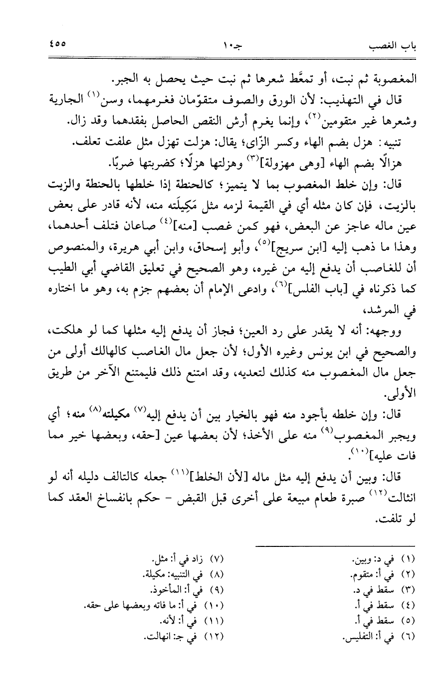 قال: وإن خلط المغصوب بما لا يتميز؛ كالحنطة إذا خلطها بالحنطة والزيت بالزيت، فإن كان مثله أي في القيمة لزمه مثل مَكِيلَته منه، لأنه قادر على بعض عين ماله عاجز عن البعض، فهو كمن غصب [منه] صاعان فتلف أحدهما، وهذا ما ذهب إليه [ابن سريج]، وأبو إسحاق، وابن أبي هريرة، اولمنصوص أن للغاصب أن يدفع إليه من غيره، وهو الصحيح في تعليق القاضي أبي الطيب كما ذكرناه في [باب الفلس]، وادعى الإمام أن بعضهم جزم به، وهو ما اختاره في المرشد.