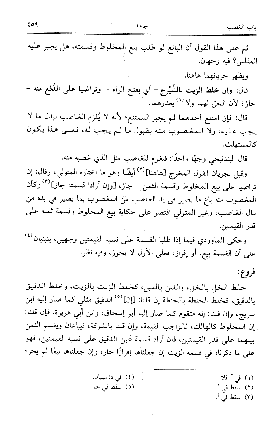 وقيل يجريان القول الخرج [هاهنا] أيضاً وهو ما اختاره المتولي، وقال: إن تراضيا على بيع المخلوط وقسمة الثمن – جاز، [وإن أرادا قسمته جاز] وكان المغصوب منه باع ما يصير في يد الغاصب من المغصوب بما يصير في يده من مال الغاصبن وغير المتولي اقتصر على حاكية بيع المخلوط وقسمة ثمنه على قدر القيمتين.