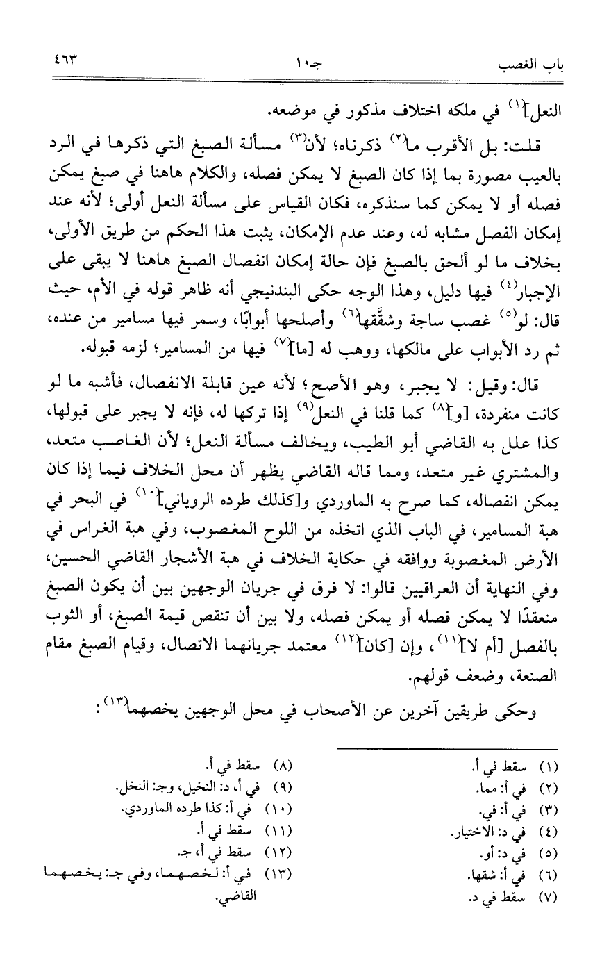قلت: بل الأقرب ما ذكرناه؛ لأن مسألة الصبغ التي ذكرها في الرد بالعيب مصورة بما إذا كان الصبغ لا يمكن فصله، والكلام هاهنا في صبغ يمكن فصله أو لا يمكن كما سنذكره، فكان القياسعلى مسألة النعل أولى؛ لأنه عند إمكان الفصل مشابه له، وعند عدم الإمكان، يثبت هذا الحكم من طريق الأولى، بخلاف ما لو ألحق بالصبغ فإن حالة إمكان انفصال الصبغ هاهنا لا يبقى على الإجبار فيها دليل، وهذا الوجه حكى البندنيجي أنه ظاهر قوله في الأم، حيث قال: لو غصب ساجة وشقَّقها وأصلحها أبواباً، وسمر فيها مسامير من عنده، ثم رد الأبواب على مالكها، ووهب له [ما] فيها من المسامير؛ لزمه قبوله.