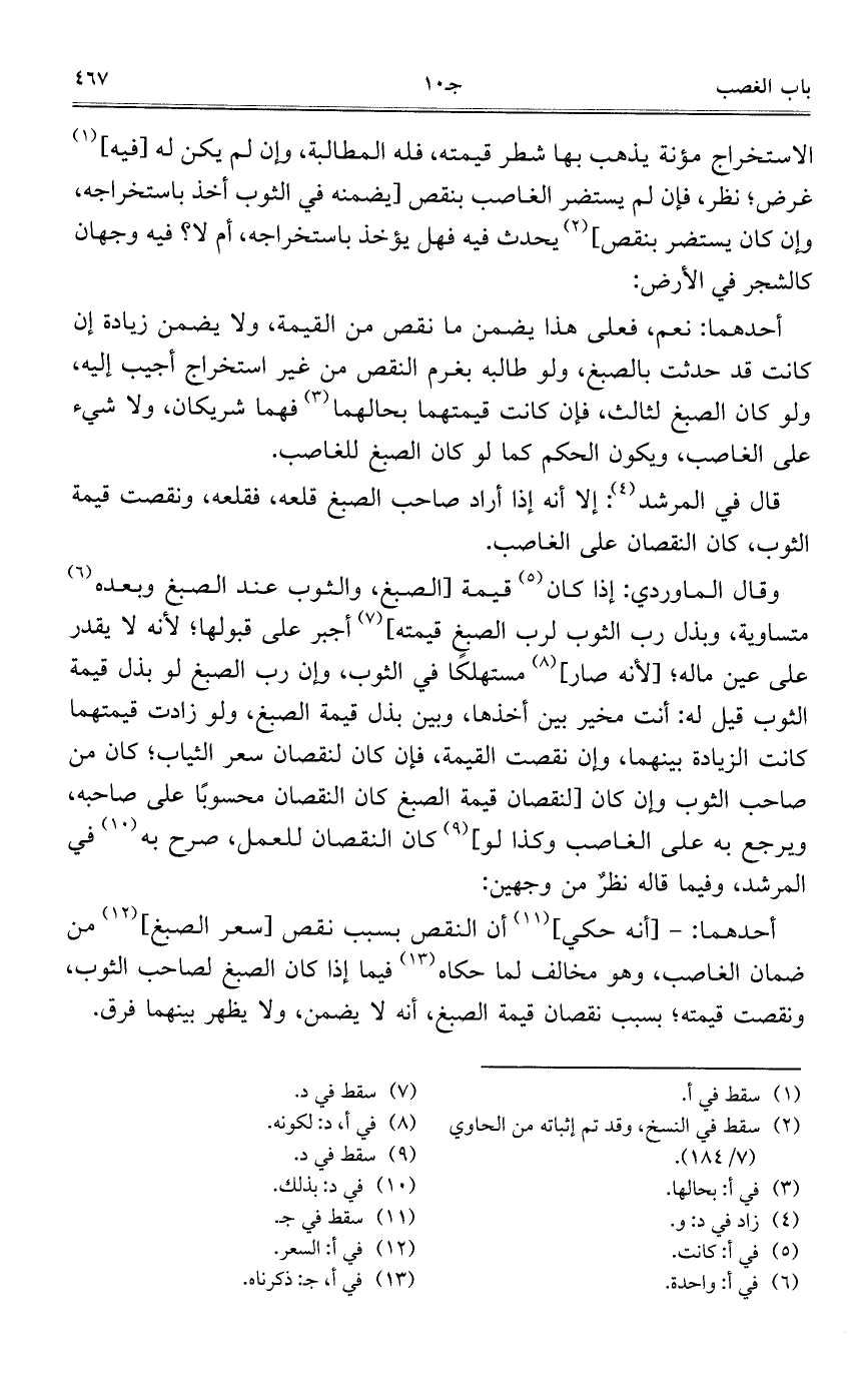 وقال الماوردي: إذا كان قيمة [الصبغ، والثوب عند الصبغ وبعده متساوية، وبذل رب الثوب لرب الصبغ قيمته] أجبر على قبولها؛ لأنه لا يقدر علىعين ماله؛ [لأه صار] مستهلكاص في الثوب، وإن رب الصبغ لو بذل قيمة الثوب قيل له: أنت مخيربين أخذها، وبين بذلقيمة الصبغ، ولو زادت قيمتهما كانت الزيادة بينهما، وإن نقصت القيمة، فإن كان لنقصان سعر الثياب؛ كان من صاحب الثوب وإن كان [لنقصان قيمة الصبغ كان النقصان محسوباً على صاحبه، ويرجع به على الغاصب وكذا لو] كان النقصان للعمل، صرح به في المرشد، وفيما قاله نظرٌ من وجهين: