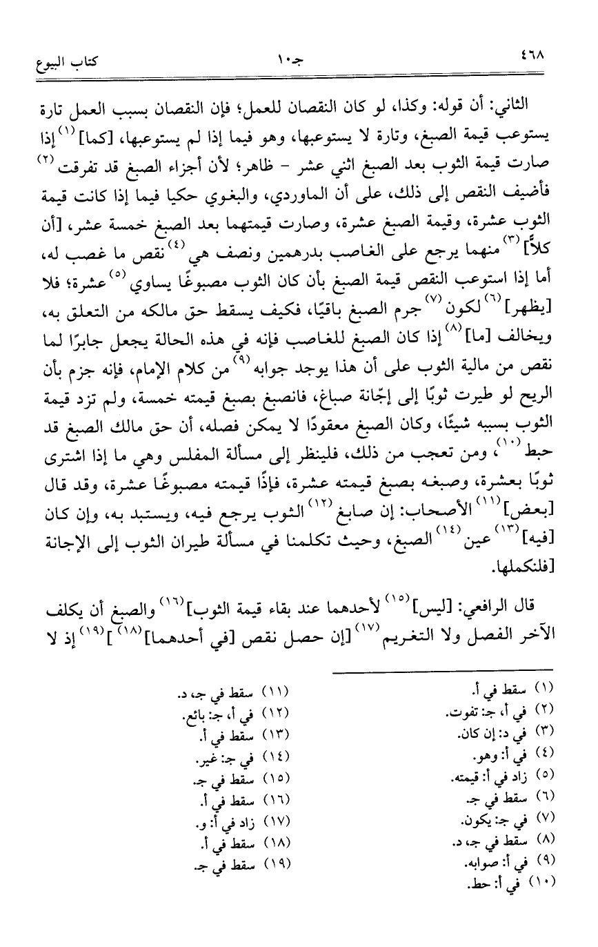 الثاني: أن قوله: وكذا، لو كان النقصان للعمل؛ فإن النقصان بسبب العمل تارة يستوعب قيمة الصبغ، وتارة لا يستوعبها، وهو فيما إذا لم يستوعبها، [كما] إذا صارت قيمة الثوب بعد الصبغ اثني عشر – ظاهر؛ لأن أجزاء الصبغ قد تفرقت فأضيف النقص إلى ذلك، على أن الماوردي، والبغوي حكيا فيما إذا كانت قيمة الثوب عشرة، وقيمة الصبغ عشرة، وصارت قيمتهما بعد الصبغ خمسة عشر، [أن كلاًّ] منهما يرجع على الغاصب بدرهمين ونصف هي نقص ما غصب له، أما إذا استوعب النقص قيمة الصبغ بأن كان الثوب مصبوغاً يساوي عشرة؛ فلا [يظهر] لكون جرم الصبغ باقياً، فكيف يسقط حق مالكه من التعلق به، ويخالف [ما] إذا كان الصبغ للغاصب فإنه في هذه الحالة يجعل جابراً لما نقص من مالية الثوب على أن هذا يوجد جوابه من كلام الإمام، فإنه جزم بأن الريح لو طيرت ثوباً إلى إجانة صباغ، فانصبغ بصبغ قيمته خمسة، ولم تزد قيمة اثلوب بسببه شيئاً، وكان الصبغ معقوداً لا يمكن فصله، أن حق مالك الصبغ قد حبط، ومن تعجب من ذلك، فلينظر إلى مسألة المفلس وهي ما إذا اشترى ثوباً بعشرة، وصبغه بصبغ قيمته عشرة، فإذاً قيمته مصبوغاً عشرة، وقد قال [بعض] الأصحاب: إن صابغ الثوب يرجع فيه، ويستبد به، وإن كان [فيه] عين الصبغ، وحيث تكلمنا في مسألة طيران الثوب إلى الإجانة [فلنكملها.