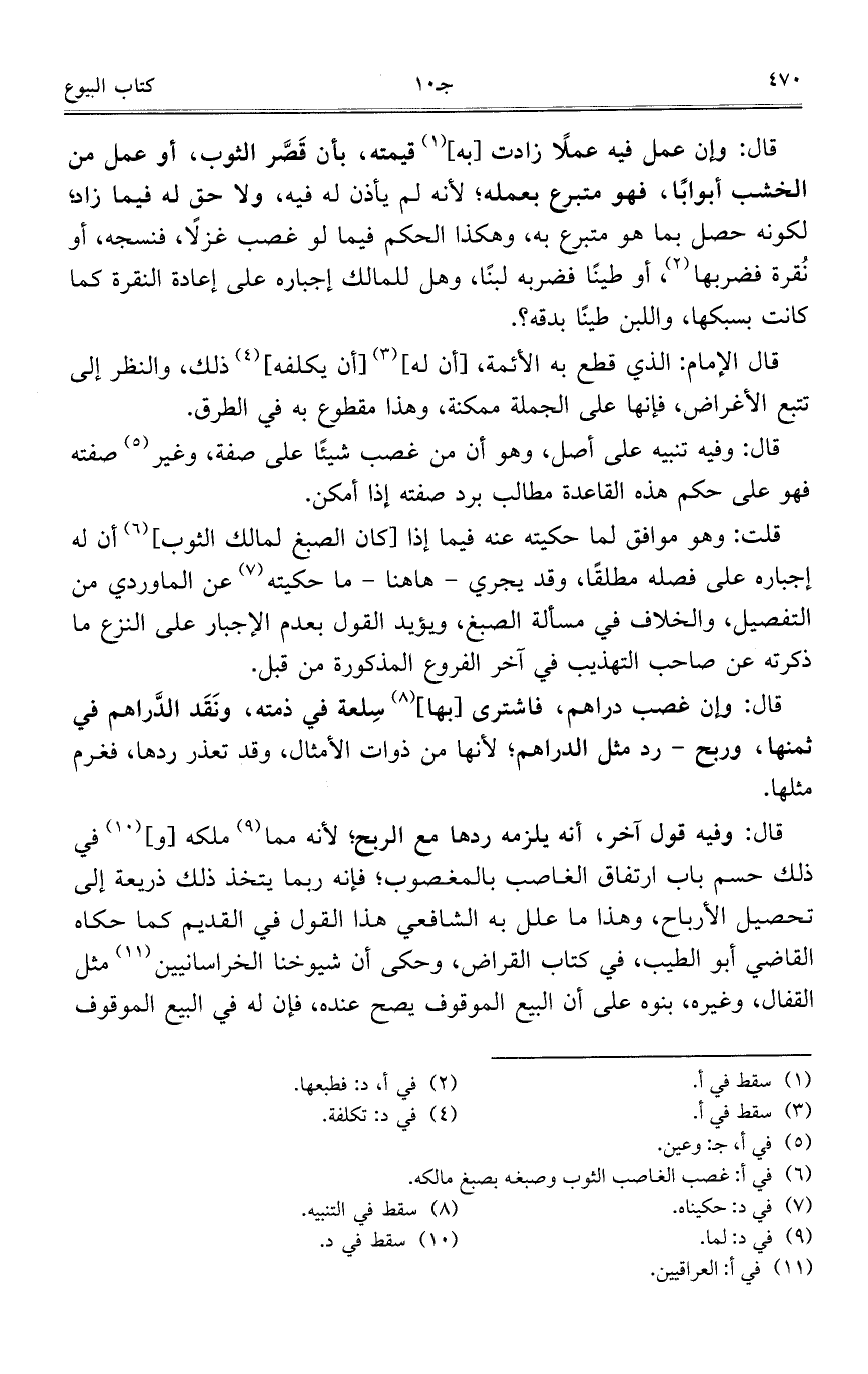 قال: وإن عمل فيه عملاً زادت [به] قيمته، بأن قَصَّر الثوب، أو علم من الخشب أبواباً، فهو متبرع بعمله: لأنه لم يأذن له فيه، ولا حق له فيما زاد، لكنه حصل بما هو متبرع به، وهكذا الحكم فيما لو غصب غزلاً، فنسجه، أو نُقرة فضربها، أو طيناً فضربه لبناً، وهل للمالك إجباره على إعادة النقرة كام كانت بسبكها، واللبن طيناً بدقه؟