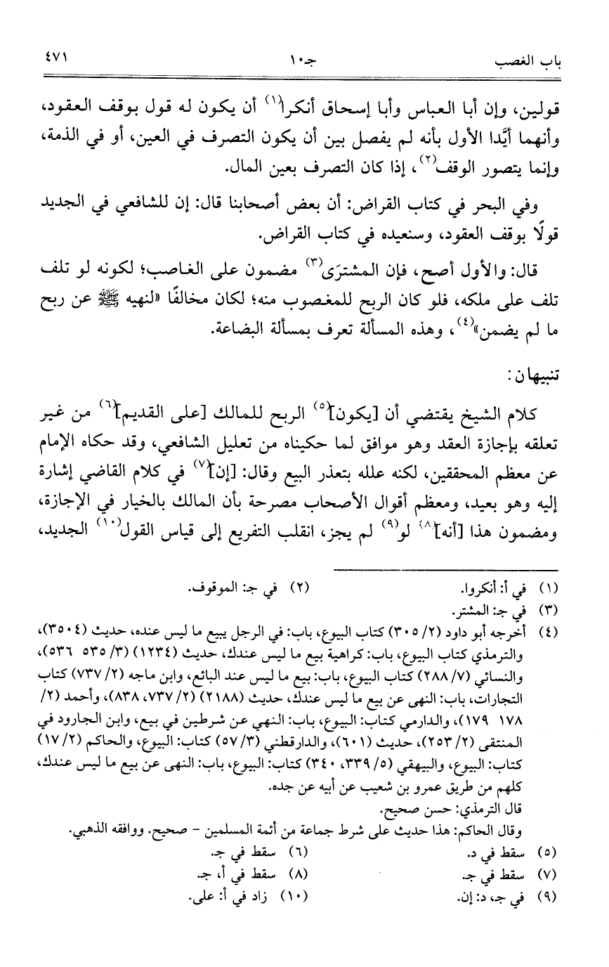 قال: والأول أصح، فإن المشترَى مضمون على الغاصب؛ لكونه لو تلف تلف على ملكه، فلو كان الربح للمغصوب منه؛ لكان مخالفاً "لنهيه صلى الله عليه وسلم عن ربح ما لم يضن"، وهذه المسألة تعرف بمسألة البضاعة.