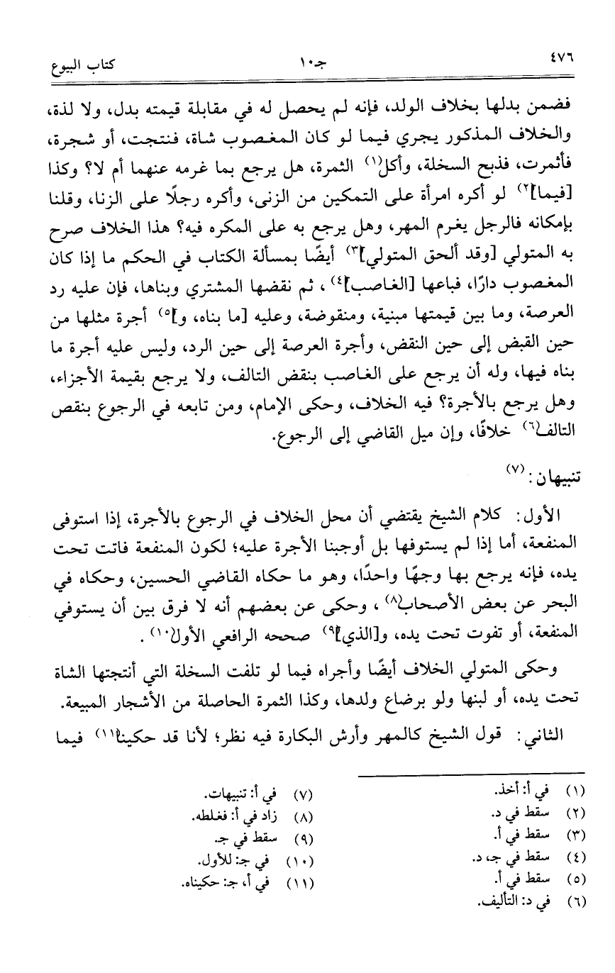 فضمن بدلها بخلاف الولد، فإنه لم يحصل له في مقابلة قيمته بدل، ولا لذة، والخلاف المذكور يجري فيما لو كان المغصوب شاة، فنتجت، أو شجرة، فأثمرت، فذبح السخلة، وأكل الثمرة، هل يرجع بما غرمه عنهما أم لا؟ وكذا [فيما] لو أكره امرأة على التمكين من الزنى، وأكره رجلاً على الزنا، وقلنا بإمكانه فالرجل يغرم المهر، وهل يرجع به على المكره فيه؟ هذا الخلاف صرح به المتولي [وقد ألحق المتولي] أيضاً بمسألة الكتاب في الحكم ما إذا كان المغصوب داراً، فباعها [الغاصب]، ثم نقضها المشتري وبناها، فإن عليه رد العرصة، وما بين قيمتها مبنية، ومنقوضة، وعليه [ما بناه، و] أجرة مثلها من حين القبض إلى حين النقض، وأجرة العرصة إلى حين الرد، وليس عليه أجرة ما بناه فيها، وله أن يرجع على الغاصب بنقض التالف، ولا يرجع بقيمة الأجزاء، وهل يرجع بالأجرة؟ فيه الخلاف، وحكى الإمام، ومن تابعه في الرجوع بنقص التالف خلافاً، وإن ميل القاضي إلى الرجوع.