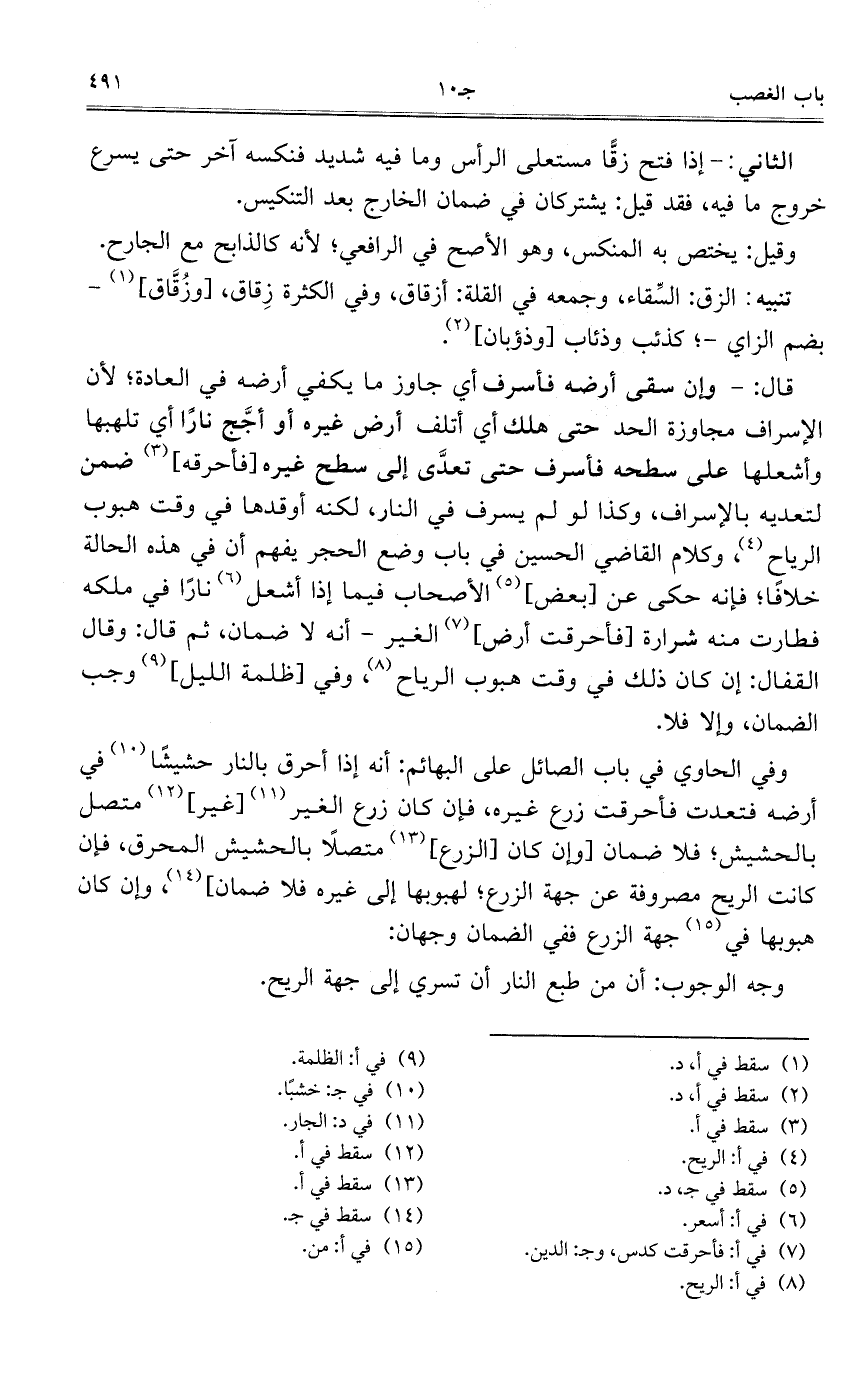 قال: -وإن سقي أرضه فأسرف أي جاوز ما يكفي أرضه في العادة؛ لأن الإسراف مجاوزة الحد حتى هلك أي أتلف أرض غيره أو أجَّج ناراً أي تلهبها وأشعلها على سطحه فأسرف حتى تعدَّى إلى سطح غيره [فأحرقه] ضمن لتعديه بالإسراف، وكذا لو لم يسرف في النار، لكنه أوقدها في قوت هبوب الرياح، وكلام القاضي الحسين في باب وضع الحجر يفهم أن في هذه الحالة خلافاً؛ فإنه حكى عن [بعض] الأصحاب فيما إذا أشعل ناراً في ملكه فطارت منه شرارة [فأحرقت أرض] الغير – انه لا ضمان، ثم قال: وقال القفال: إن كان ذلك في وقت هبوب الرياح، وفي [ظلمة الليل] وجب الضمان، وإلا فلا.