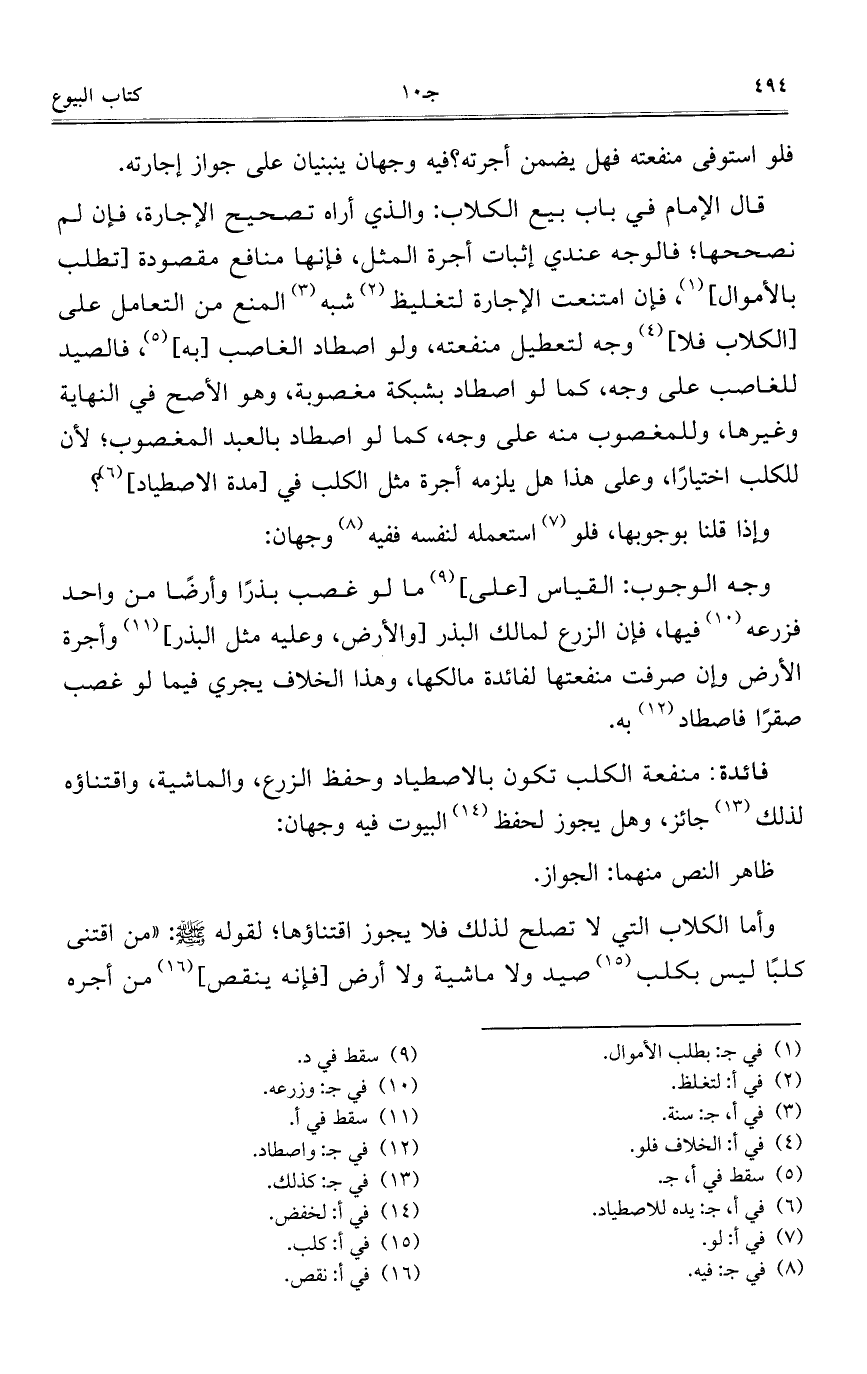 فائدة: منفعة الكلب تكون بالاصطياد وحفظ الزرع، والماشية، واقتناؤه لذلك جائز، وهل يجوز لحفظ البيوت فيه وجهان: