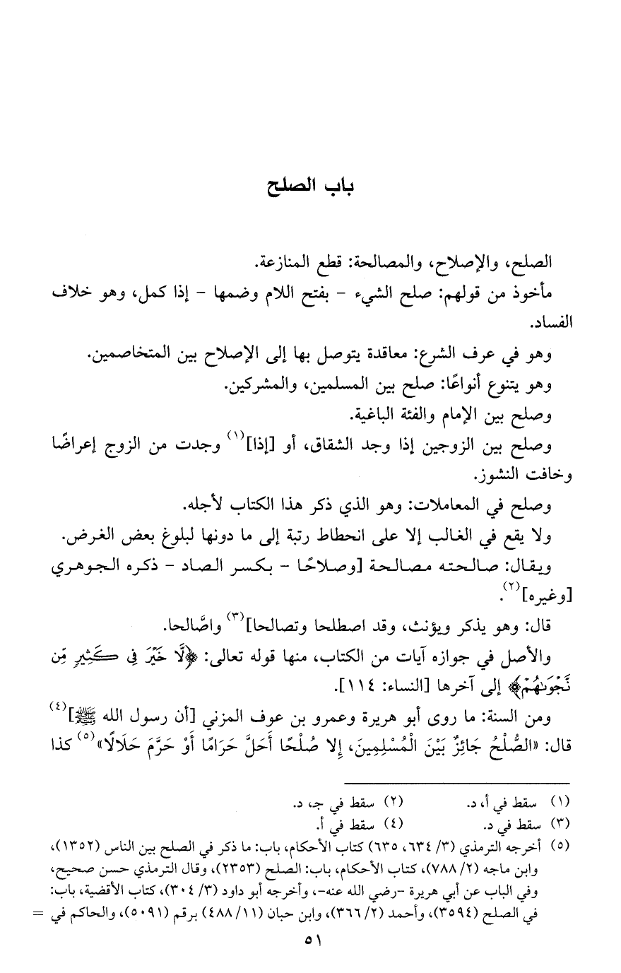 ومن السنة: ما روى أبو هريرة وعمرو بن عوف المزني [أن رسول الله صلى الله عليه وسلم] قال: "الصُّلْحُ جَائِزٌ بَيْنَ الْمُسْلِمِينَ، إِلا صُلْحاً حَرَاماً أَوْ حَرَّمَ حَلاَلاً" كذا