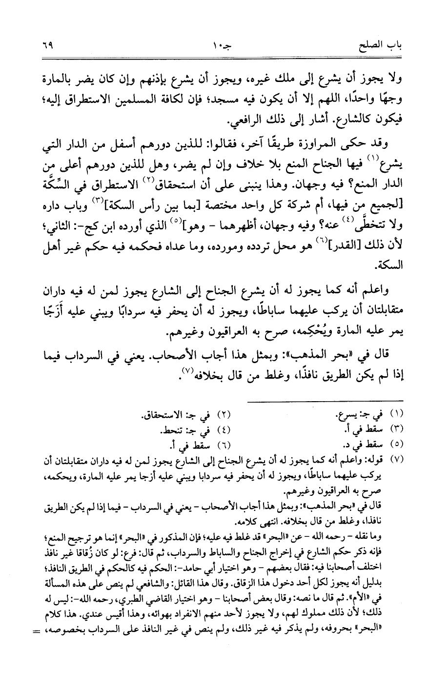 وقد حكى المراوزة طريقاً آخر، فقالوا: للذين دورهم أسفل من الدار التي يشرع فيها الجناح المنع بلا خلاف وإن لم يضر، وهل للذين دورهم أعلى من الدار المنع؟ فيه وجهان. وهذا ينبني على أن استحقاق الاستطراق في السِّكَّة [لجميع من فيها، أم شركة كل واحد مختصة [بما بين رأس السكة] وباب داره ولا تتخطَّى عنه؟ وفيه وجهان، أظهرهما –وهو] الذي أورده ابن كج -: الثاني؛ لأن ذلك [القدر] هو محل تردده ومورده، وما عداه فحكمه فيه حكم غير أهل السكة.