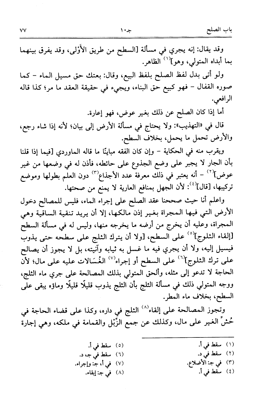 واعلم أنا حيث صححنا عقد الصلح على إجراء الماء، فليس للمصالح دخول الأرض التي فيها المجراة بغير إذن مالكها، إلا أن يريد تنقية الساقية وهي المجارة، وعليه أن يخرج من أرضه ما يخرجه منها، وليس له في مسألة السطح [إلقاء الثلوج] على السطح، [ولا أن يترك الثلج على سطحه حتى يذوب فيسيل إليه، ولا أن يجري فيه ما غسل به ثيابه وآنيته، بل لا يجوز أن يصالح على ترك الثلوج] على السطح أو إجراء الغُسَالات عليه على مال؛ لأن الحاجة لا تدعو إلى مثلهن وألحق المتولي بذلك المصالحة على جري ماء الثلج، ووجه المتولي ذلك في مسألة الثلج بأن الثلج يذوب قليلاً قليلاً وماؤه يبقى على السطح، بخلاف ماء المطر.