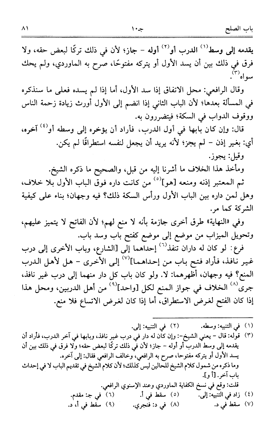 يقدمه إلى وسط الدرب أو أوله – جاز؛ لان في ذلك تركاً لبعض حقه، ولا فرق في ذلك بين أن يسد الأول أو يتركه مفتوحاً، صرح به الماوردي، ولم يحك سواه.