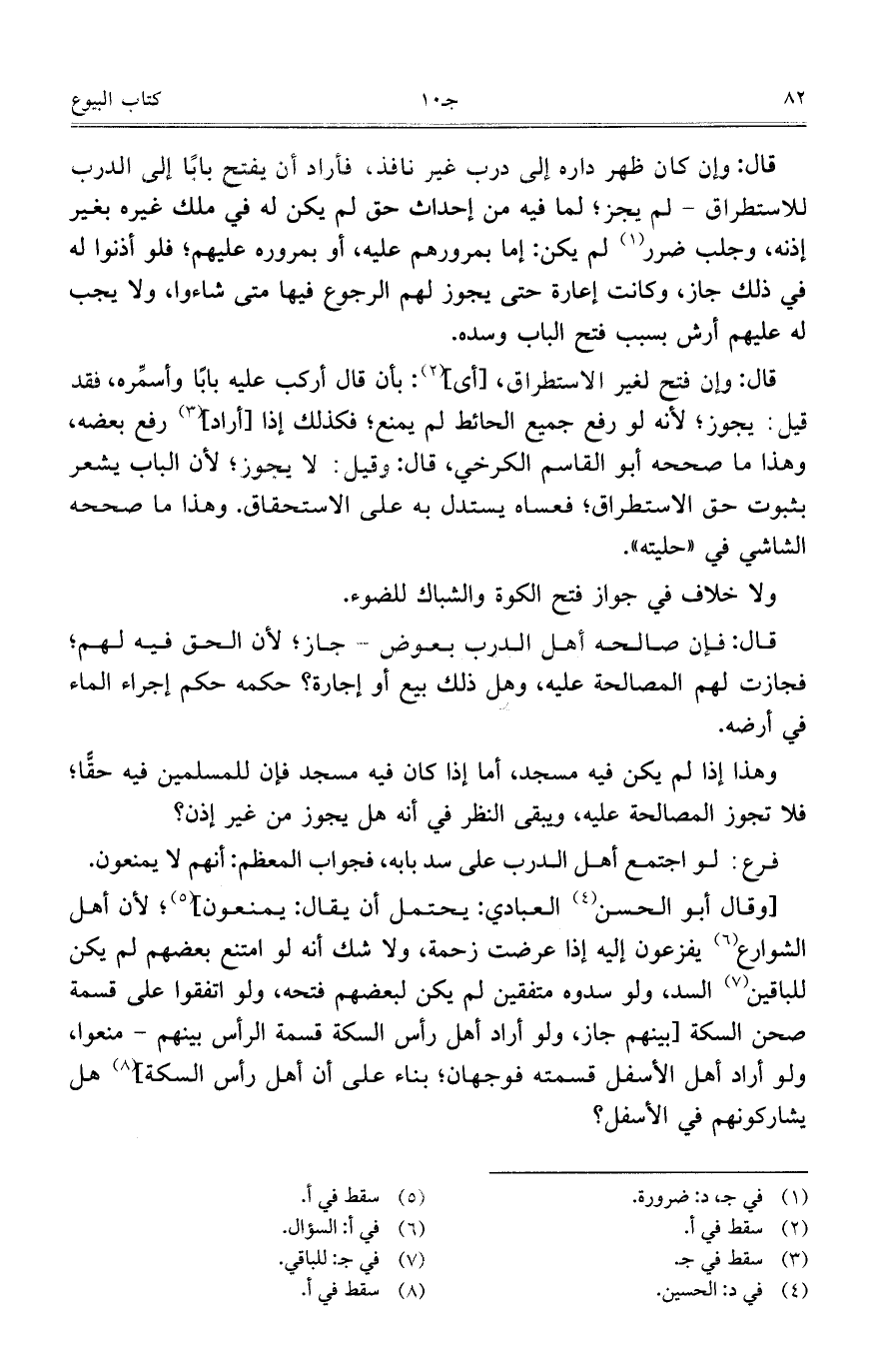 قال: وإن فتح لغير الاستطراق، [أي]: بأن قال أركب عليه باباً وأسمِّره، فقد قيل: يجوز؛ لأنه لو رفع جميع الحائط لم يمنع؛ فكذلك إذا [أراد] رفع بعضه، وهذا ما صححه أبو القاسم الكرخي، قال: وقيل: لا يجوز؛ لأن الباب يشعر بثبوت حق الاستطراق؛ فعساه يستدل به على الاستحقاق، وهذا ما صححه الشاشي في "حلبته".