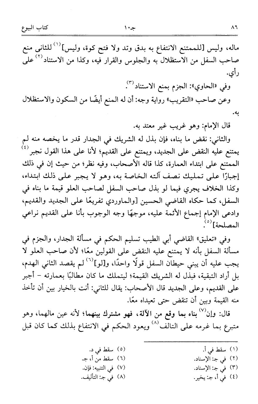 ماله، وليس [للممتنع الانتفاع به بدق وتد ولا فتح كوة، وليس] للثاني منع صاحب السفل من الاستظلال به والجلوس والقرار فيه، وكذا من الاستناد على رأي.