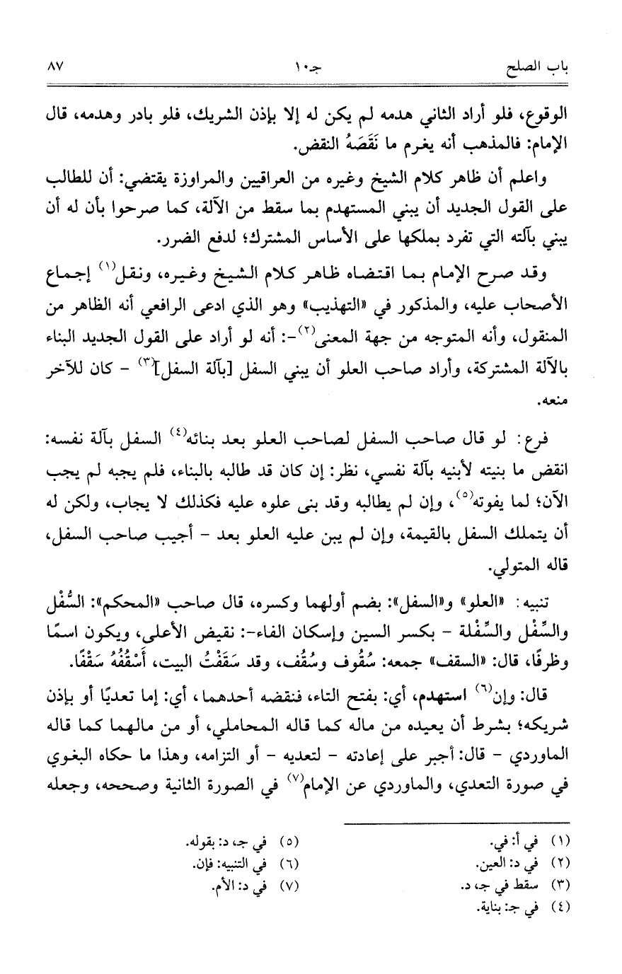 فرع: لو قال صاحب السفل لصاحب العلو بعد بنائه السفل بآلة نفسه: انقض ما بنيته لأبنية بآلة نفسين نظر: إن كان قد طالبه بالبناء، فلم يجبه لم يجب الآن؛ لما يفوته، وإن لم يطالبه وقد بنى علوه عليه فكذلك لا يجاب، ولكن له أن يتملك السفل بالقيمة، وإن لم يبن عليه العلو بعد – أجيب صاحب السفل، قاله المتولي.