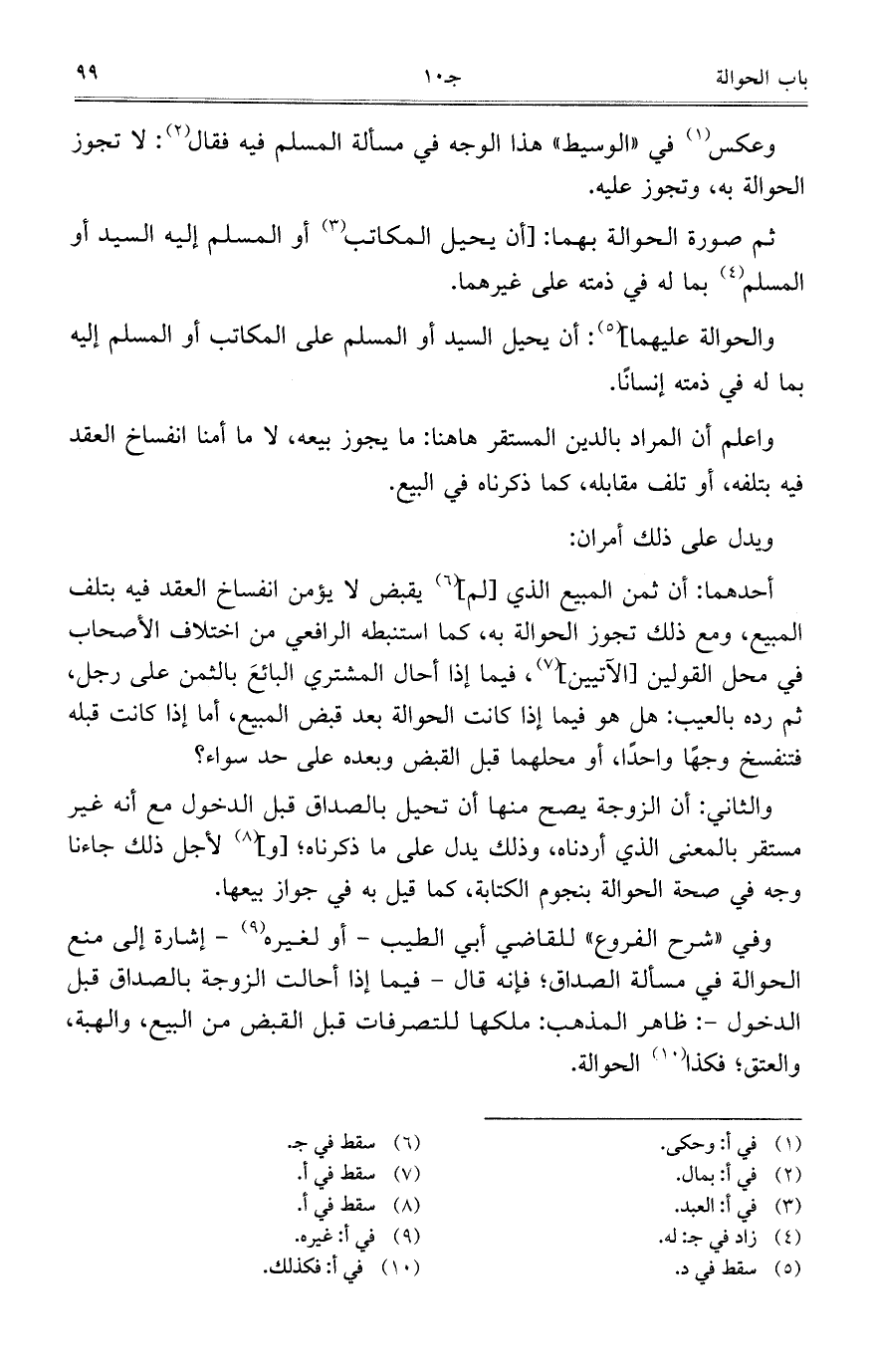 وفي "شرح الفروع" للقاضي أبي الطيب – أو لغيره – إشارة إلى منع الحوالة في مسألة الصداق؛ فإنه قال –فيما إذا أحالت الزوجة بالصداق قبل الدخول -: ظاهر المذهب: ملكها للتصرفات قبل القبض من البيع، والهبة، والعتق؛ فكذا الحوالة.