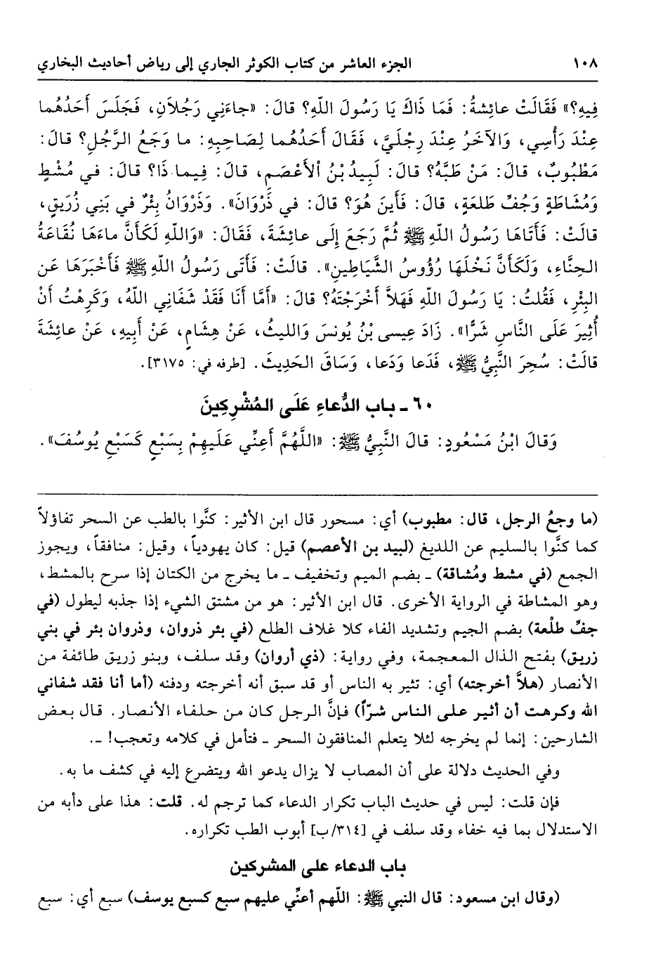 (ما وجعُ الرجل، قال: مطبوب) أي: مسحور قال ابن الأثير: كنَّوا بالطب عن السحر تفاؤلًا كما كنَّوا بالسليم عن اللديغ (لبيد بن الأعصم) قيل: كان يهوديًّا، وقيل: منافقًا، ويجوز الجمع (في مشط ومُشاقة) -بضم الميم وتخفيف- ما يخرج من الكتان إذا سرح بالمشط، وهو المشاطة في الرواية الأخرى. قال ابن الأثير: هو من مشتق الشيء إذا جذبه ليطول (في جفِّ طلْعة) بضم الجيم وتشديد الفاء كلا غلاف الطلع (في بثر ذروان، وذروان بئر في بني زريق) بفتح الذال المعجمة، وفي رواية: (ذي أروان) وقد سلف، وبنو زريق طائفة من الأنصار (هلَّا أخرجته) أي: تثير به الناس أو قد سبق أنه أخرجته ودفنه (أما أنا فقد شفاني الله وكرهت أن أثير على الناس شرًّا) فإنَّ الرجل كان من حلفاء الأنصار. قال بعض الشارحين: إنما لم يخرجه لئلا يتعلم المنافقون السحر -فتأمل في كلامه وتعجب! -.