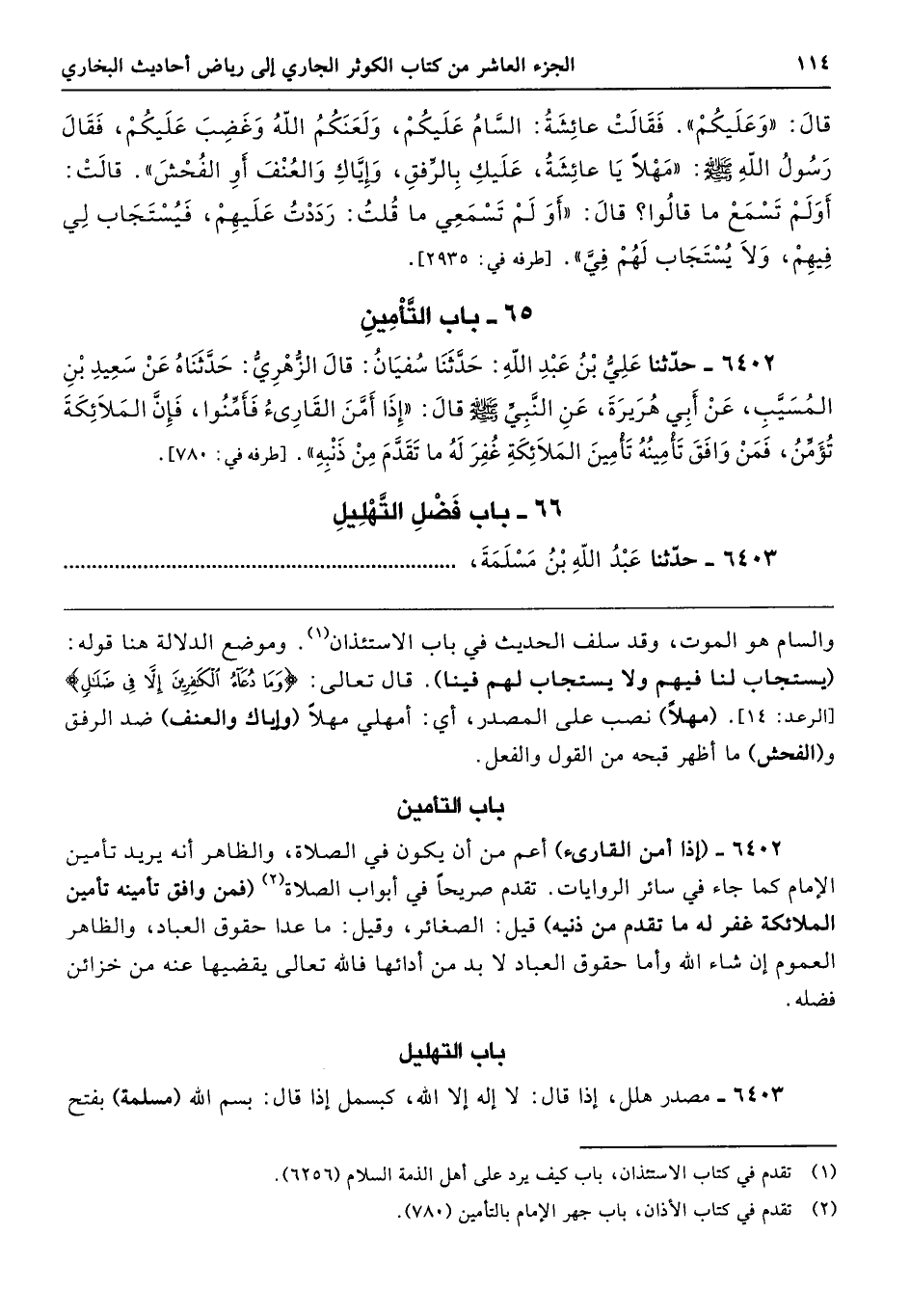 6402 - (إذا أمن القارئ) أعم من أن يكون في الصلاة، والظاهر أنه يريد تأمين الإمام كما جاء في سائر الروايات. تقدم صريحًا في أبواب الصلاة (فمن وافق تأمينه تأمين الملائكة غفر له ما تقدم من ذنيه) قيل: الصغائر، وقيل: ما عدا حقوق العباد، والظاهر العموم إن شاء الله وأما حقوق العباد لا بد من أدائها فالله تعالى يقضيها عنه من خزائن فضله.