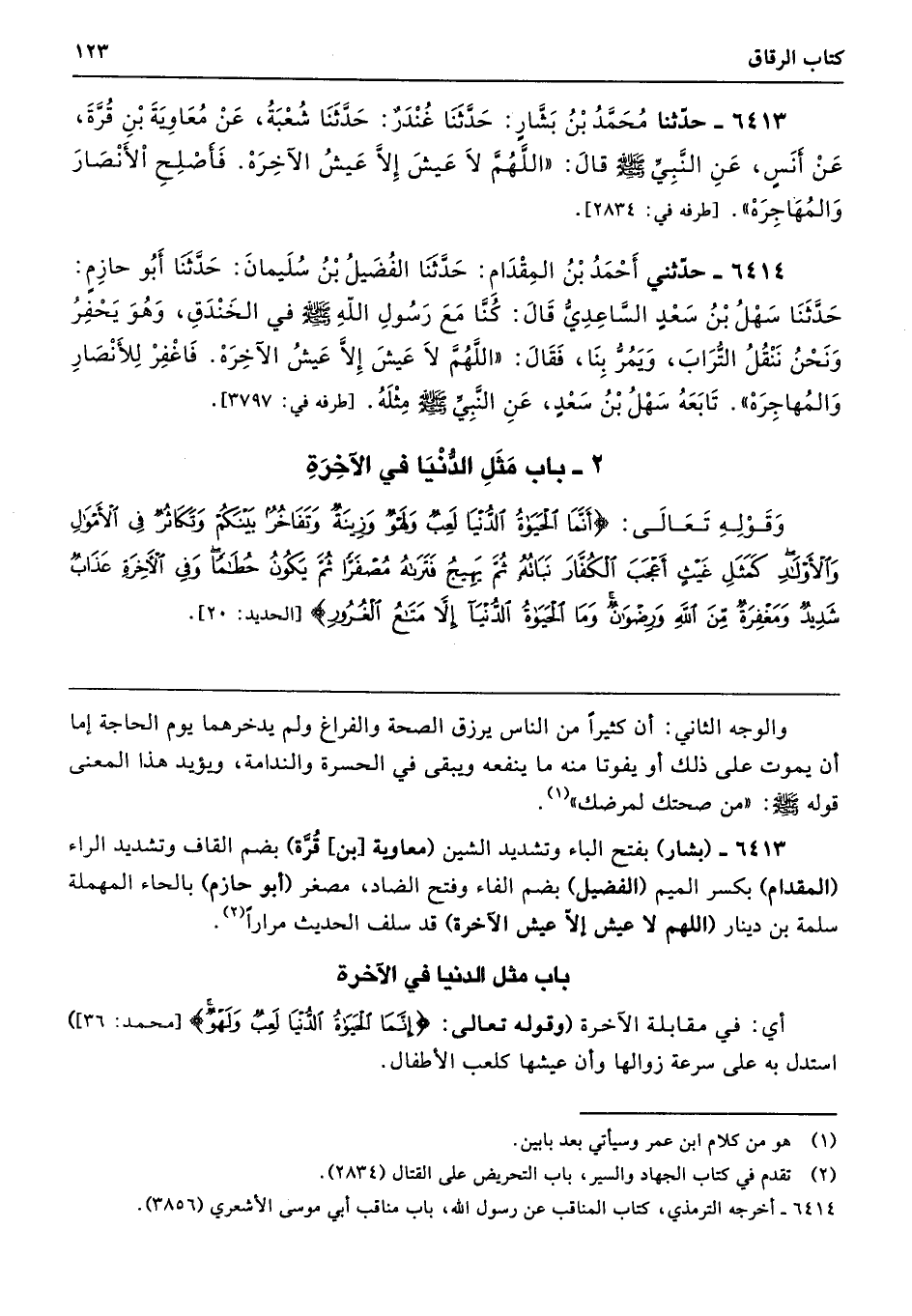 6413 - (بشار) بفتح الباء وتشديد الشين (معاوية [بن] قُرَّة) بضم القاف وتشديد الراء (المقدام) بكسر الميم (الفضيل) بضم الفاء وفتح الضاد، مصغر (أبو حازم) بالحاء المهملة سلمة بن دينار (اللهم لا عيش إلّا عيش الآخرة) قد سلف الحديث مرارًا.
