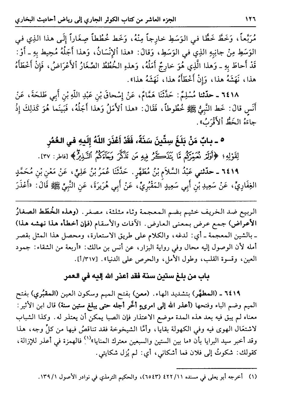 6419 - (المطهَّر) بتشديد الهاء. (معن) بفتح الميم وسكون العين (المقبُري) بفتح الميم وضم الباء وفتحها (أعذر الله إلى امرئٍ أخَّر أجله حتى يبلغ ستين سنة) قال ابن الأثير: معناه لم يبق فيه بعد هذه المدة موضع الاعتذار فإن الصبا يمكن أن يعتذر له. وكذا الشباب لاشتعَال الهوى فيه وفي الكهولة بقايا، وأمَّا الشيخوخة فقد تناقصُ فيها من كلِّ وجه، هذا وقد أخبر سيد البرايا بأن "ما بين الستين والسبعين معترك المنايا" فالهمزة في أعذر للإزالة، كقولك: شكوتُ إلى فلان فما أشكاني، أي: لم يُزل شكايتي.