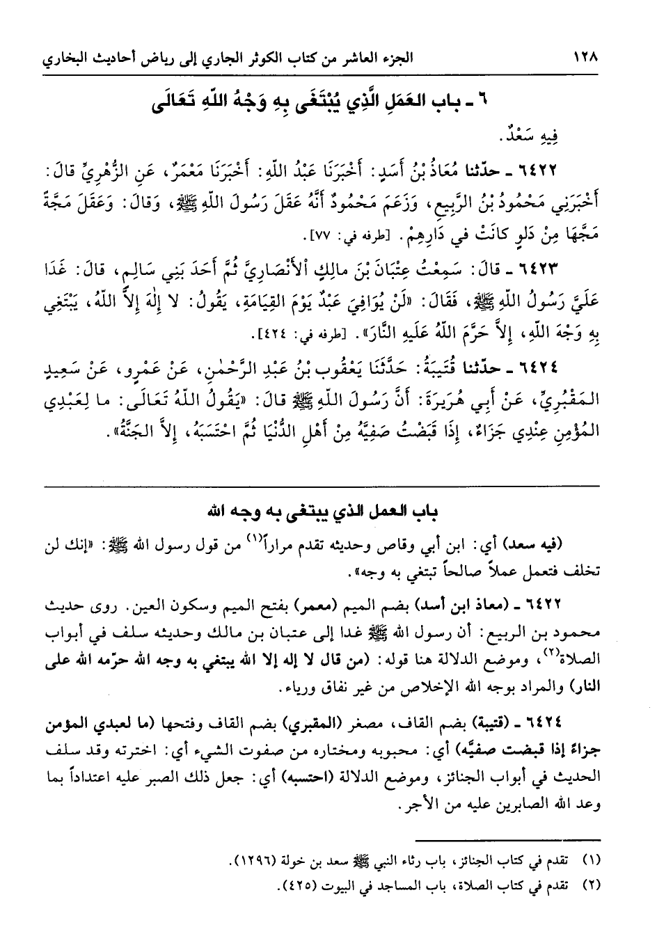 6424 - (قتيبة) بضم القاف، مصغر (المقبري) بضم القاف وفتحها (ما لعبدي المؤمن جزاءٌ إذا قبضت صفيَّه) أي: محبوبه ومختاره من صفوت الشيء أي: اخترته وقد سلف الحديث في أبواب الجنائز، وموضع الدلالة (احتسبه) أي: جعل ذلك الصبر عليه اعتدادًا بما وعد الله الصابرين عليه من الأجر.