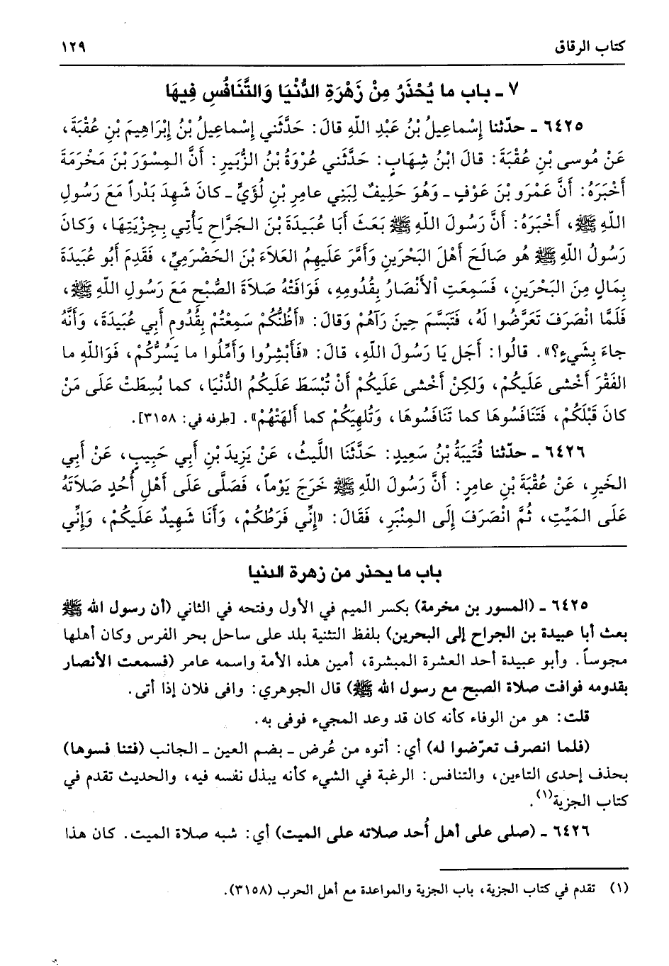 6425 - (المسور بن مخرمة) بكسر الميم في الأول وفتحه في الثاني (أن رسول الله - صلى الله عليه وسلم - بعث أبا عبيدة بن الجراح إلى البحرين) بلفظ التثنية بلد على ساحل بحر الفرس وكان أهلها مجوسًا. وأبو عبيدة أحد العشرة المبشرة، أمين هذه الأمة واسمه عامر (فسمعت الأنصار بقدومه فوافت صلاة الصبح مع رسول الله - صلى الله عليه وسلم -) قال الجوهري: وافى فلان إذا أتى.