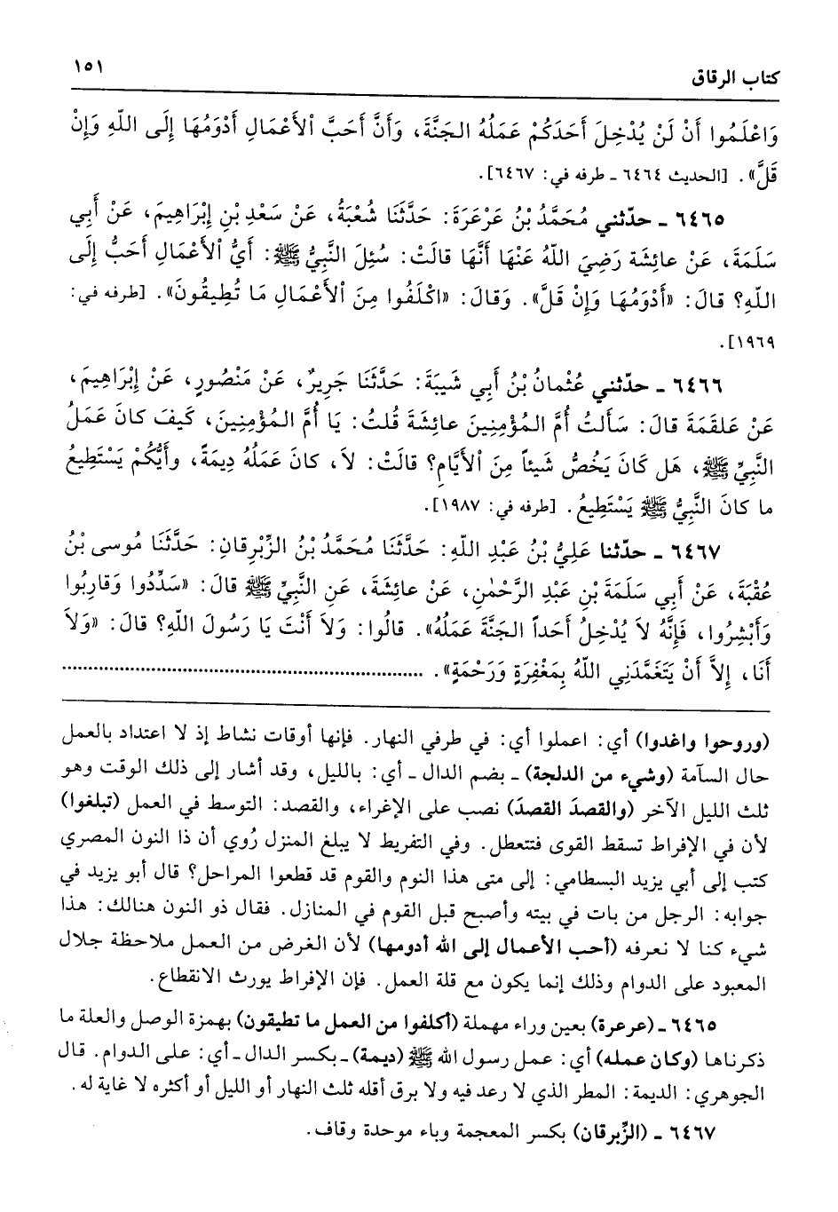 6465 - حَدَّثَنِى مُحَمَّدُ بْنُ عَرْعَرَةَ حَدَّثَنَا شُعْبَةُ عَنْ سَعْدِ بْنِ إِبْرَاهِيمَ عَنْ أَبِى سَلَمَةَ عَنْ عَائِشَةَ - رضى الله عنها - أَنَّهَا قَالَتْ سُئِلَ النَّبِىُّ - صلى الله عليه وسلم - أَىُّ الأَعْمَالِ أَحَبُّ إِلَى اللَّهِ قَالَ «أَدْوَمُهَا وَإِنْ قَلَّ». وَقَالَ «اكْلَفُوا مِنَ الأَعْمَالِ مَا تُطِيقُونَ». طرفه 1969