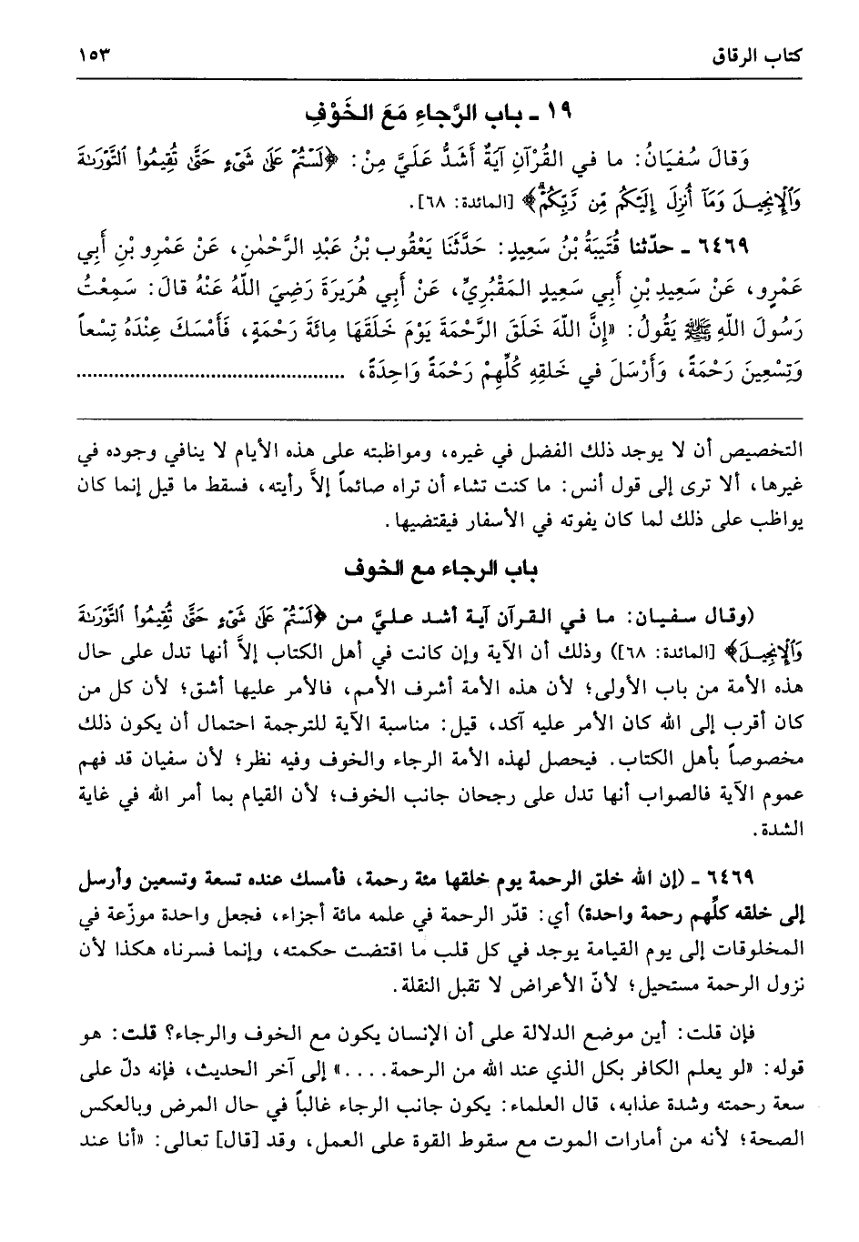 (وقال سفيان: ما في القرآن أية أشد عليَّ من {لَسْتُمْ عَلَى شَيْءٍ حَتَّى تُقِيمُوا التَّوْرَاةَ وَالْإِنْجِيلَ} [المائدة: 68]) وذلك أن الآية وإن كانت في أهل الكتاب إلَّا أنها تدل على حال هذه الأمة من باب الأولى؛ لأن هذه الأمة أشرف الأمم، فالأمر عليها أشق؛ لأن كل من كان أقرب إلى الله كان الأمر عليه آكد، قيل: مناسبة الآية للترجمة احتمال أن يكون ذلك مخصوصًا بأهل الكتاب. فيحصل لهذه الأمة الرجاء والخوف وفيه نظر؛ لأن سفيان قد فهم عموم الآية فالصواب أنها تدل على رجحان جانب الخوف؛ لأن القيام بما أمر الله في غاية الشدة.