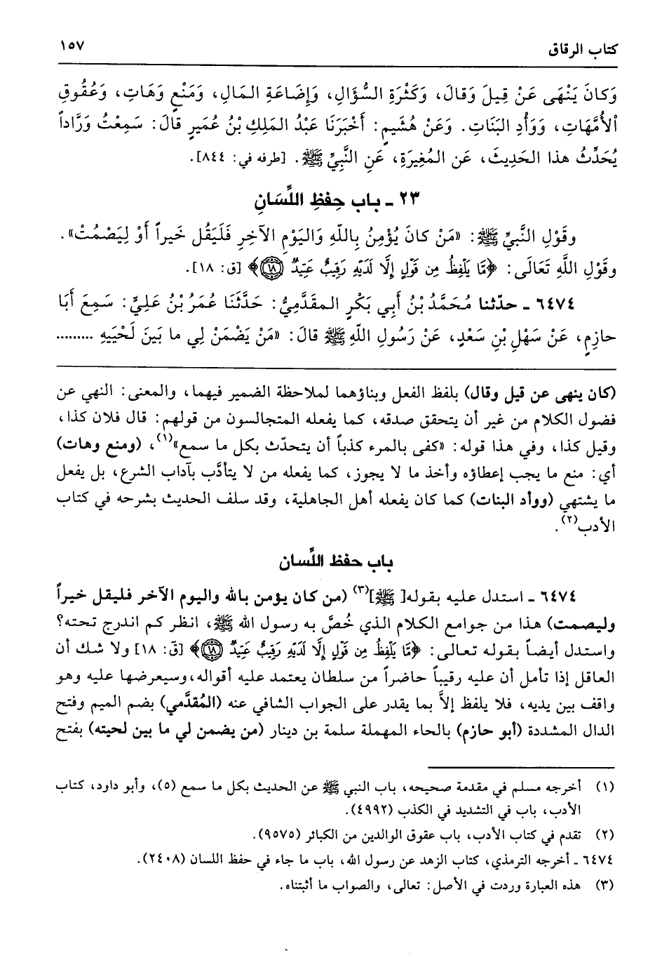 6474 - استدل عليه بقوله [- صلى الله عليه وسلم -] (من كان يومن بالله واليوم الآخر فليقل خيرًا وليصمت) هذا من جوامع الكلام الذي خُصَّ به رسول الله - صلى الله عليه وسلم -، انظر كم اندرج تحته؟ واستدل أيضًا بقوله تعالى: {مَا يَلْفِظُ مِنْ قَوْلٍ إِلَّا لَدَيْهِ رَقِيبٌ عَتِيدٌ (18)} [ق: 18] ولا شك أن العاقل إذا تأمل أن عليه رقيبًا حاضرًا من سلطان يعتمد عليه أقواله، وسيعرضها عليه وهو واقف بين يديه، فلا يلفظ إلَّا بما يقدر على الجواب الشافي عنه (المُقدَّمي) بضم الميم وفتح الدال المشددة (أبو حازم) بالحاء المهملة سلمة بن دينار (من يضمن لي ما بين لحيته) بفتح