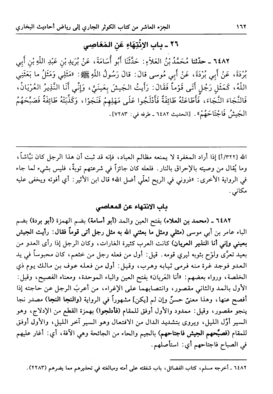 6482 - (محمد بن العلاء) بفتح العين والمد (أبو أسامة) بضم الهمزة (أبو بردة) بضم الباء عامر بن أبي موسى (مثلي ومثل ما بعثني الله به مثل رجل أتى قومًا فقال: رأيت الجيش بعيني وإني أنا النذير العريان) كانت العرب كثيرة الغارات، وكان الرجل إذا رأى العدو من بعيد تعرَّى ولوّح بثوبه ليري قومه. قيل: أول من فعله رجل من خثعم، كان محبوسًا في يد العدو فوجد غرة منه فرمى ثيابه وهرب، وقيل: أول من فعله عوف بن مالك يوم ذي الخلصة، ورواه بعضهم: "أنا العَربان" بفتح العين والباء الموحدة، ومعناه الفصيح، وقيل: الأول بالمد والثاني مقصور، وانتصابهما على الإغراء، من أعربَ الرجل عن حاجته إذا أفصح عنها، وهذا معنىً حسنٌ وإن لم [يكن] مشهورًا في الرواية (والنجا النجا) مصدر نجا ينجو مقصور، وقيل: ممدود والأول أوفق للمقام (فأدلجوا) بهمزة القطع من الإدلاج، وهو السير أوَّل الليل، ويروى بتشديد الدال من الافتعال وهو السير آخر الليل، والأول أوفق للمقام (فصبَّحهم الجيش فاجتاحهم) بالجيم والحاء من الجائحة وهي الآفة، أي: أغار عليهم في الصباح فاجتاحهم أي: استأصلهم.