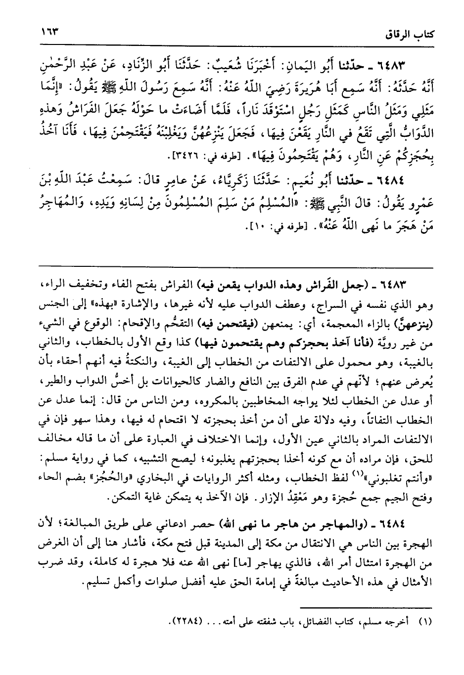 6483 - (جعل الفَراش وهذه الدواب يقعن فيه) الفراش بفتح الفاء وتخفيف الراء، وهو الذي نفسه في السراج، وعطف الدواب عليه لأنه غيرها، والإشارة "بهذه" إلى الجنس (ينزعهنَّ) بالزاء المعجمة، أي: يمنعهن (فيقتحمن فيه) التقحُّم والإقحام: الوقوع في الشيء من غير رويَّة (فانا آخذ بحجزكم وهم يقتحمون فيها) كذا وقع الأول بالخطاب، والثاني بالغيبة، وهو محمول على الالتفات من الخطاب إلى الغيبة، والنكتةُ فيه أنهم أحقاء بأن يُعرض عنهم؛ لأنّهم في عدم الفرق بين النافع والضار كالحيوانات بل أخسُّ الدواب والطير، أو عدل عن الخطاب لئلا يواجه المخاطبين بالمكروه، ومن الناس من قال: إنما عدل عن الخطاب التفاتًا، وفيه دلالة على أن من أخذ بحجزته لا اقتحام له فيها، وهذا سهو فإن في الالتفات المراد بالثاني عين الأول، وإنما الاختلاف في العبارة على أن ما قاله مخالف للحق، فإن مراده أن مع كونه أخذا بحجزتهم يغلبونه؛ ليصح التشبيه، كما في رواية مسلم: "وأنتم تغلبوني" لفظ الخطاب، ومثله أكثر الروايات في البخاري "والحُجُز" بضم الحاء وفتح الجيم جمع حُجزة وهو مَعْقِدُ الإزار. فإن الآخذ به يتمكن غاية التمكن.