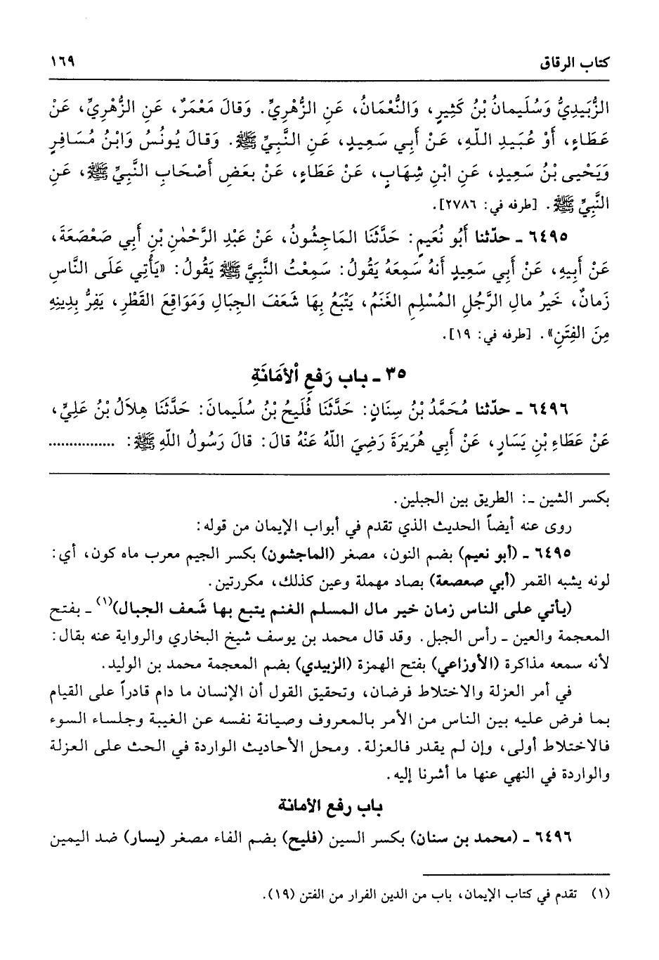 (يأتي على الناس زمان خير مال المسلم الغنم يتبع بها شَعف الجبال) -بفتح المعجمة والعين- رأس الجبل. وقد قال محمَّد بن يوسف شيخ البخاري والرواية عنه بقال: لأنه سمعه مذاكرة (الأوزاعي) بفتح الهمزة (الزبيدي) بضم المعجمة محمَّد بن الوليد.