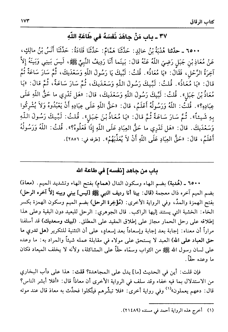 6500 - (هُدبة) بضم الهاء وسكون الدال (همام) بفتح الهاء وتشديد الميم. (معاذ) بضم الميم آخره ذال معجمة (قال: بينا أنا رديف النبي - صلى الله عليه وسلم -[ليس] بيني وبينه إلّا آخره الرحل) بفتح الهمزة والمدِّ، وفي الرواية الأخرى: (مُؤْخِرة الرحل) بضم الميم وسكون الهمزة بكسر الخاء: الخشبة التي يستند إليها الراكب. قال الجوهري: الرجل للبعيد دون البقية وعلى هذا إطلاقه على رحل الحمار مجاز على إطلاق المقيد على المطلق. (لبيك وسعديك) قد أسلفنا مرارًا أن معناه: إجابة بعد إجابة وإسعادًا بعد إسعادٍ، على أن التثنية للتكرير (هل تدري ما حق العباد على الله) العبد لا يستحق على مولاه في مقابلة عمله شيئًا والمراد به: ما وعده على لسان رسول الله - صلى الله عليه وسلم - من الثواب وسمّاه حقًّا على المشاكلة، ولأنه لا يخلف الميعاد فكان ما وعده حقًّا.