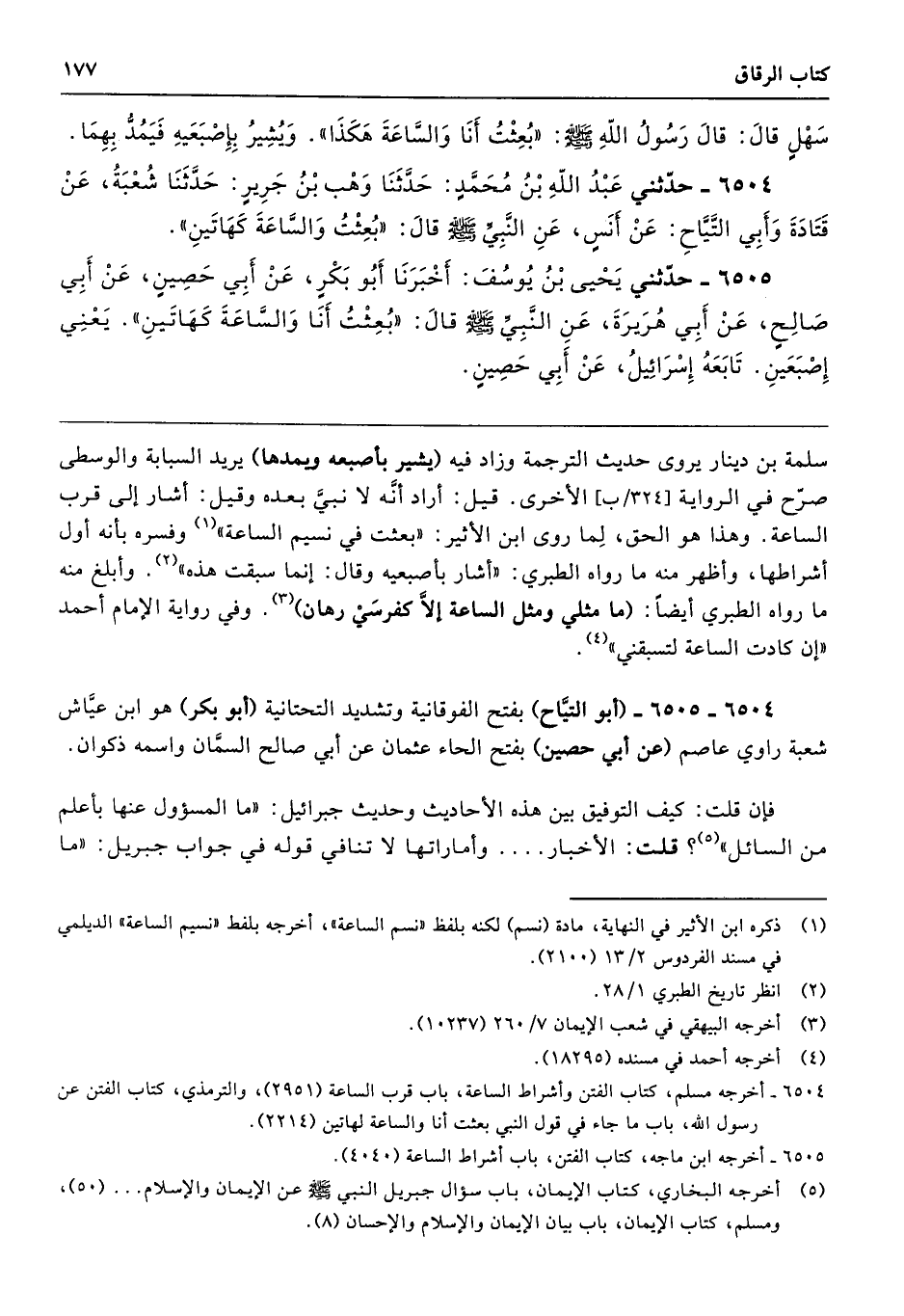 6504 - حَدَّثَنِى عَبْدُ اللَّهِ بْنُ مُحَمَّدٍ - هُوَ الْجُعْفِىُّ - حَدَّثَنَا وَهْبُ بْنُ جَرِيرٍ حَدَّثَنَا شُعْبَةُ عَنْ قَتَادَةَ وَأَبِى التَّيَّاحِ عَنْ أَنَسٍ عَنِ النَّبِيِّ - صلى الله عليه وسلم - قَالَ «بُعِثْتُ أَنَا وَالسَّاعَةَ كَهَاتَيْنِ».