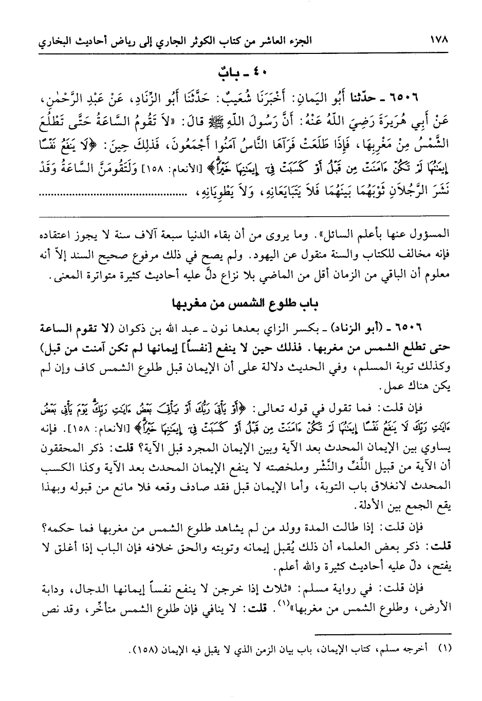 6506 - (أبو الزناد) -بكسر الزاي بعدها نون- عبد الله بن ذكوان (لا تقوم الساعة حتى تطلع الشمس من مغربها. فذلك حين لا ينفع [نفسًا] إيمانها لم تكن آمنت من قبل) وكذلك توبة المسلم، وفي الحديث دلالة على أن الإيمان قبل طلوع الشمس كاف وإن لم يكن هناك عمل.