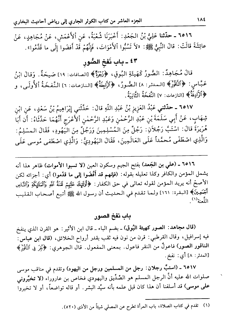 6517 - (استبَّ رجلان: رجل من المسلمين ورجل من اليهود) وتقدم في مناقب موسى صلوات الله عليه أنَّ الرجل المسلم هو الصِّدِّيق واليهودي فخاص بن عاروراء (لا تخيِّروني على موسى) قد أسلفنا أن هذا كان قبل علمه بأنه سيِّد البشر. أو قاله تواضعًا، أو لا تخيروا