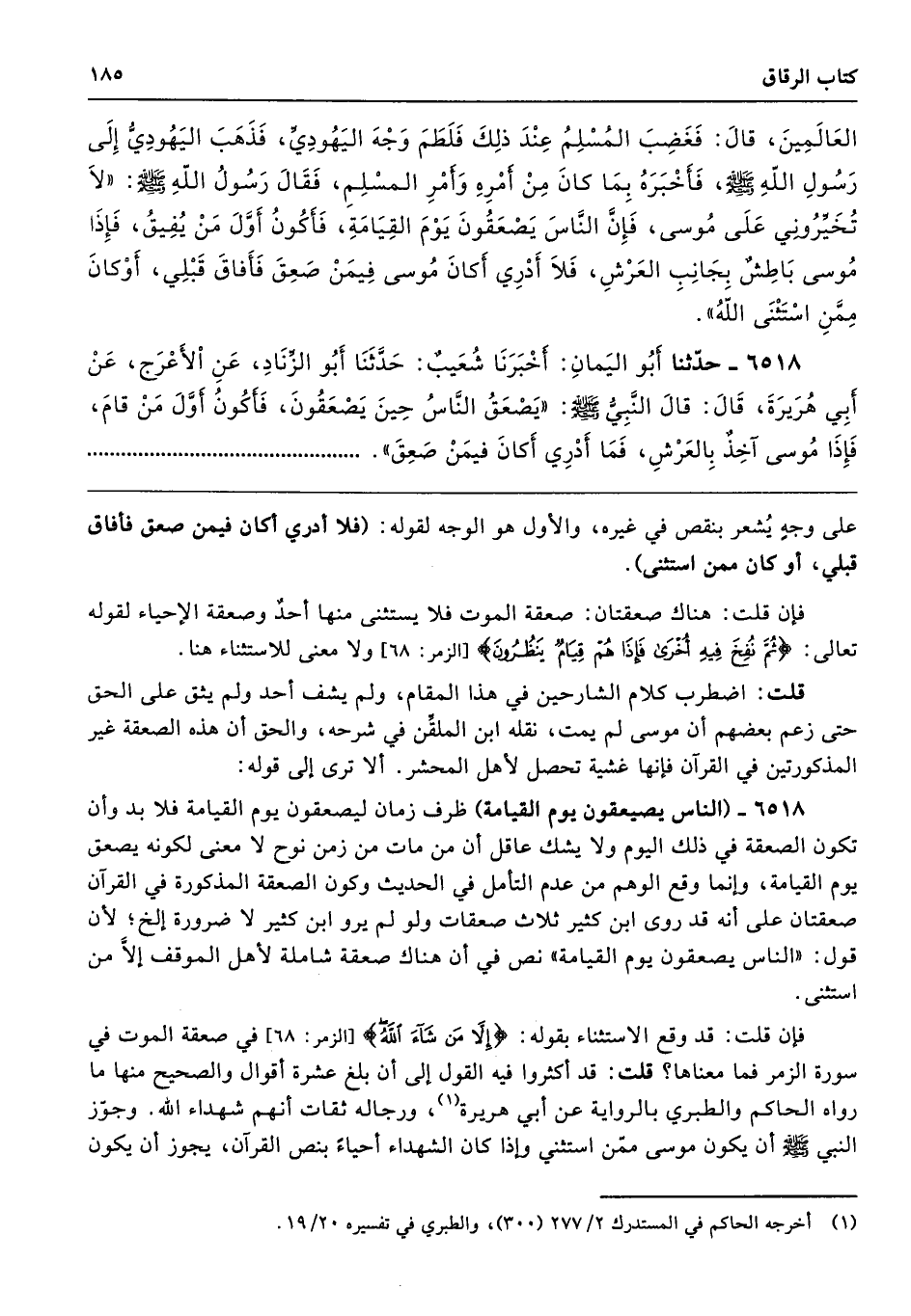 6518 - (الناس يصعقون يوم القيامة) ظرف زمان ليصعقون يوم القيامة فلا بد وأن تكون الصعقة في ذلك اليوم ولا يشك عاقل أن من مات من زمن نوح لا معنى لكونه يصعق يوم القيامة، وإنما وقع الوهم من عدم التأمل في الحديث وكون الصعقة المذكورة في القرآن صعقتان على أنه قد روى ابن كثير ثلاث صعقات ولو لم يرو ابن كثير لا ضرورة إلخ؛ لأن قول: "الناس يصعقون يوم القيامة" نص في أن هناك صعقة شاملة لأهل الموقف إلَّا من استثنى.