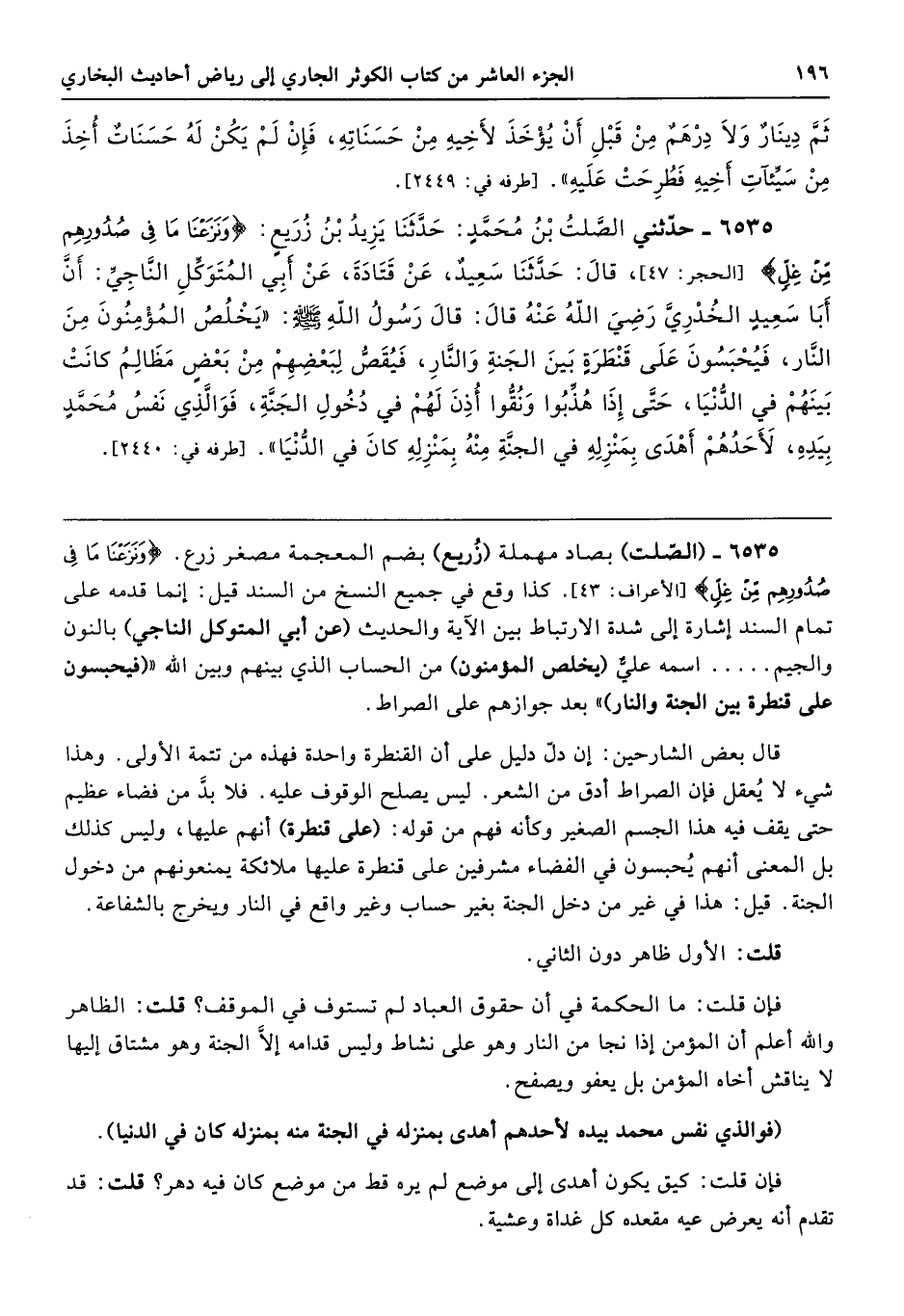 6535 - (الصّلت) بصاد مهملة (زُريع) بضم المعجمة مصغر زرع. {وَنَزَعْنَا مَا فِي صُدُورِهِمْ مِنْ غِلٍّ} [الأعراف: 43]. كذا وقع في جميع النسخ من السند قيل: إنما قدمه على تمام السند إشارة إلى شدة الارتباط بين الآية والحديث (عن أبي المتوكل الناجي) بالنون والجيم ..... اسمه عليٌّ (يخلص المومنون) من الحساب الذي بينهم وبين الله " (فيحبسون على قنطرة بين الجنة والنار) " بعد جوازهم على الصراط.