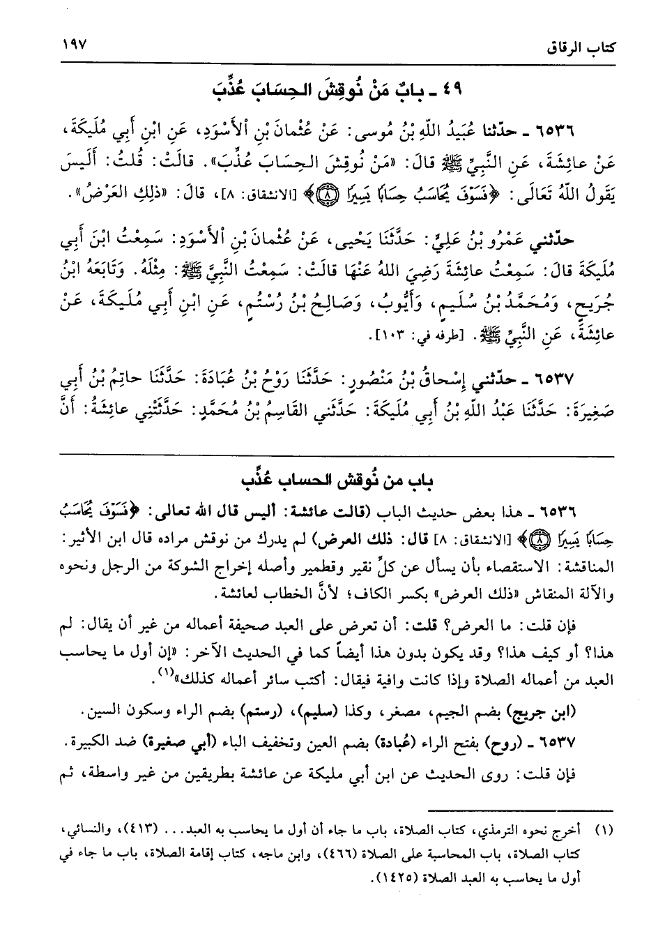 6536 - هذا بعض حديث الباب (قالت عائشة: أليس قال الله تعالى: {فَسَوْفَ يُحَاسَبُ حِسَابًا يَسِيرًا (8)} [الانشقاق: 8] قال: ذلك العرض) لم يدرك من نوقش مراده قال ابن الأثير: المناقشة: الاستقصاء بأن يسأل عن كلِّ نقير وقطمير وأصله إخراج الشوكة من الرجل ونحوه والآلة المنقاش "ذلك العرض" بكسر الكاف؛ لأنَّ الخطاب لعائشة.