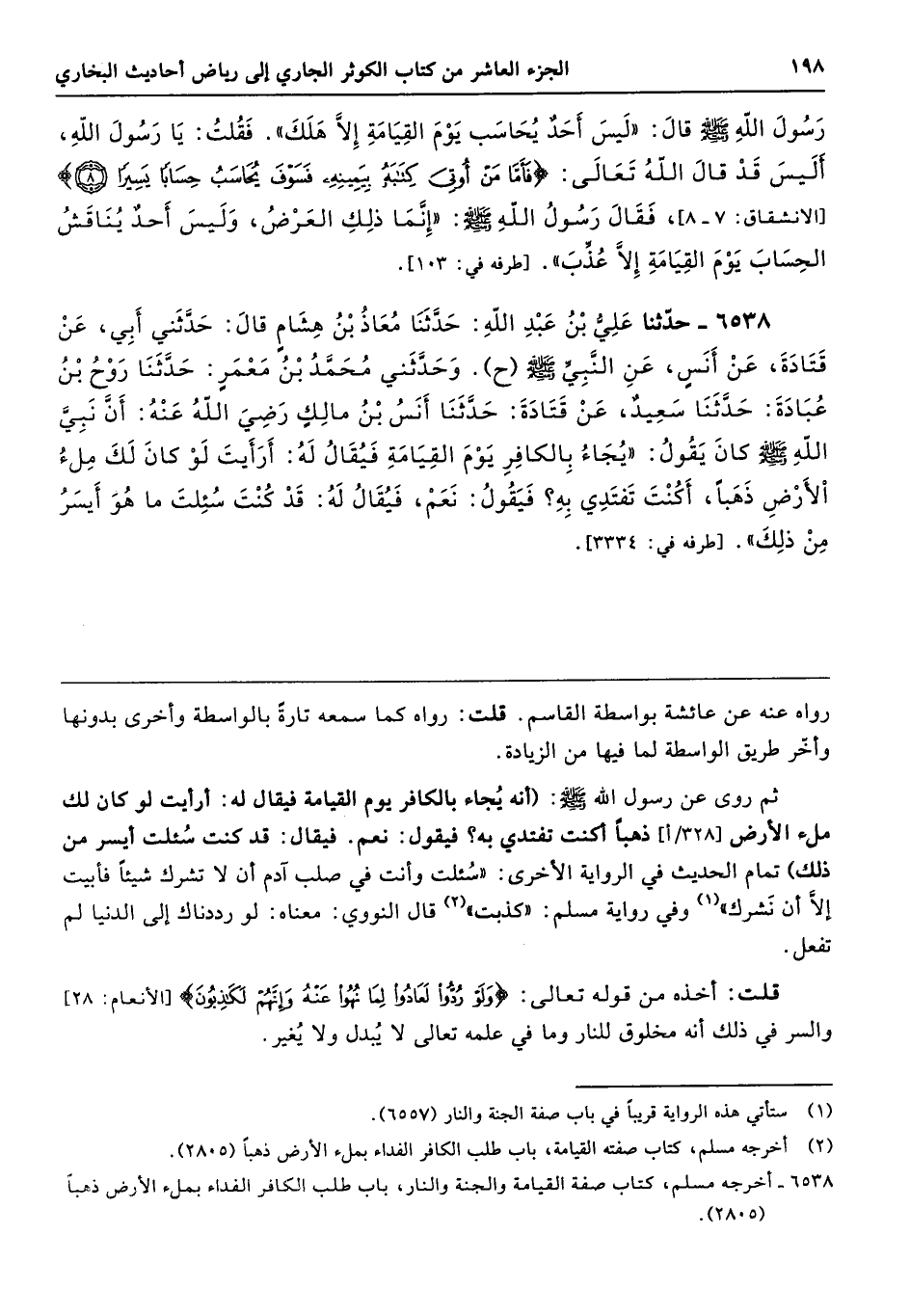 ثم روى عن رسول الله - صلى الله عليه وسلم -: (أنه يُجاء بالكافر يوم القيامة فيقال له: أرأيت لو كان لك ملء الأرض ذهبًا أكنت تفتدي به؟ فيقول: نعم. فيقال: قد كنت سُئلت أيسر من ذلك) تمام الحديث في الرواية الأخرى: "سُئلت وأنت في صلب آدم أن لا تشرك شيئًا فأبيت إلَّا أن نَشرك" وفي رواية مسلم: "كذبت" قال النووي: معناه: لو رددناك إلى الدنيا لم تفعل.