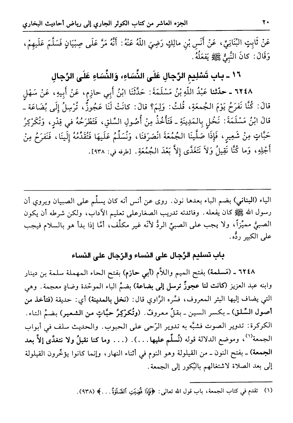 6248 - (مَسلمة) بفتح الميم واللَّام (أبي حازم) بفتح الحاء المهملة سلمة بن دينار وابنه عبد العزيز (كانت لنا عجوزٌ ترسل إلى بضاعة) بضمِّ الباء الموحّدة وضادٍ معجمة. وهي التي يضاف إليها البئر المعروف، فسَّره الرَّاوي قال: (نخل بالمدينة) أي: حديقة (فتأخذ من أصول السِّلق) -بكسر السين- بقلٌ معروفٌ. (وتُكرْكِرُ حبَّاتِ من الشعير) بضمِّ التاء. الكركرة: تدوير الصوت فشبَّه به تدوير الرّحى على الحبوب. والحديث سلف في أبواب الجمعة، وموضع الدلالة قوله (نُسلِّم عليها ...). (... وما كنا نقبلُ ولا نتغدَّى إلَّا بعد الجمعة) -بفتح النون- من القيلولة وهو النوم في أثناء النهار، وإنما كانوا يؤخِّرون القيلولة إلى بعد الصلاة لاشتغالهم بالبُكور إلى الجمعة.