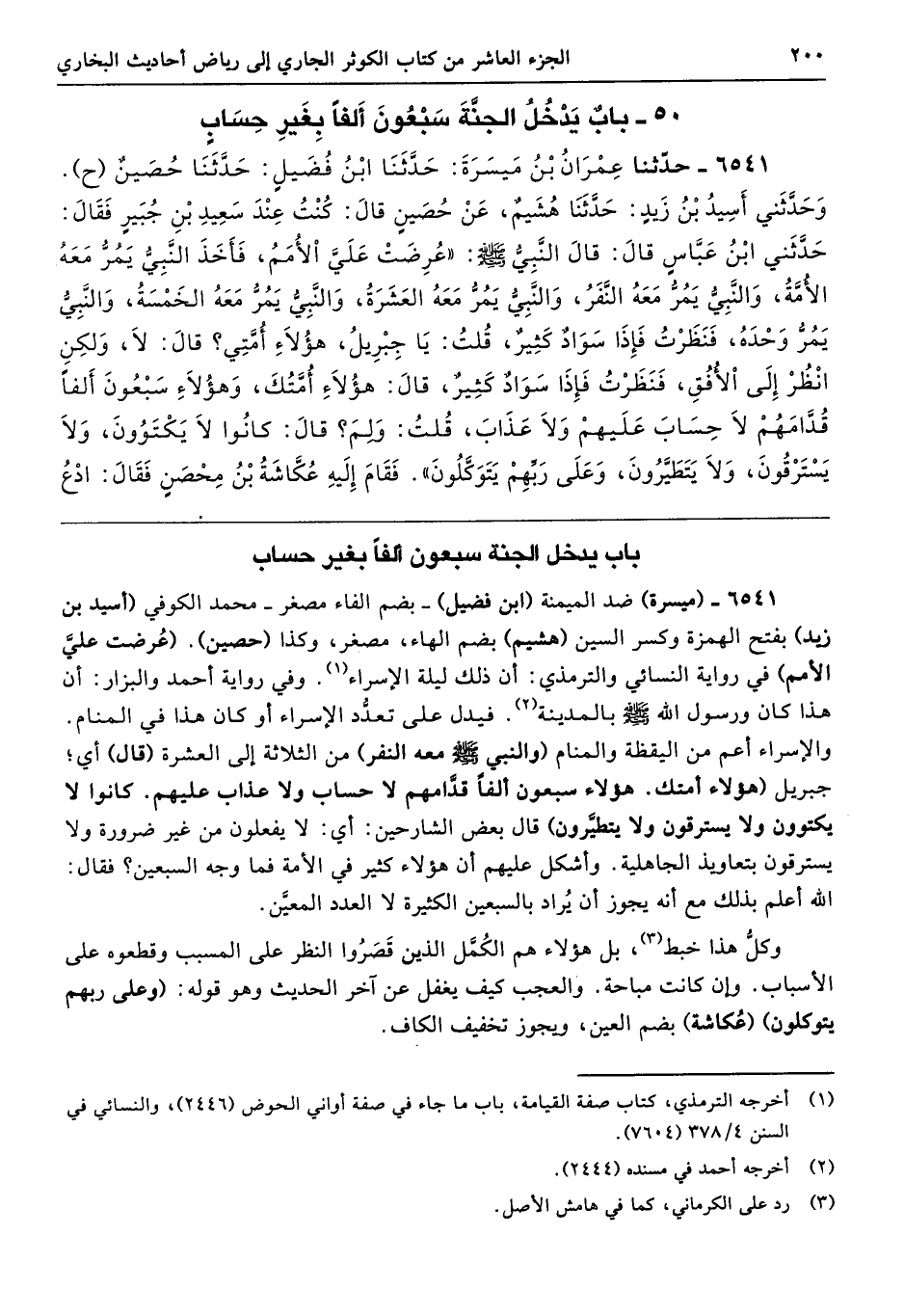 وكلُّ هذا خبط، بل هؤلاء هم الكُمَّل الذين قَصَرُوا النظر على المسبب وقطعوه على الأسباب. وإن كانت مباحة. والعجب كيف يغفل عن آخر الحديث وهو قوله: (وعلى ربهم يتوكلون) (عُكاشة) بضم العين، ويجوز تخفيف الكاف.