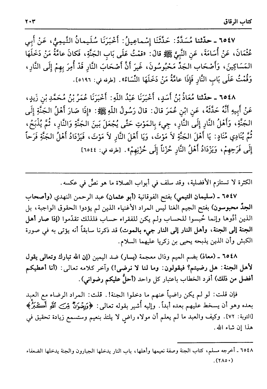 6547 - (سليمان التيمي) بفتح الفوقانية (أبو عثمان) عبد الرحمن النهدي (وأصحاب الجدِّ محبوسون) بفتح الجيم الغنا ليس المراد الأغنياء الذين لم يؤدوا الحقوق الواجبة، بل الذين أدَّوها وإنما حُبسوا للحساب ولم يكن للفقراء حساب فلذلك تقدّموا (إذا صار أهل الجنة إلى الجنة، وأهل النار إلى النار جيء بالموت) قد ذكرنا سابقًا أنه يؤتى به في صورة الكبش وأن الذين يذبحه يحيى بن زكريا عليهما السلام.