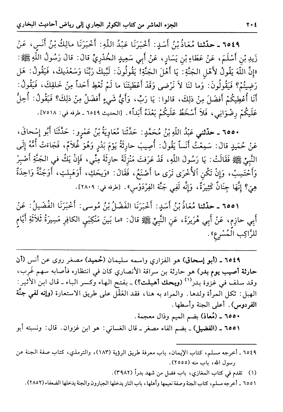 6549 - (أبو إسحاق) هو الفزاري واسمه سليمان (حُميد) مصغر روى عن أنس (أن حارثة أصيب يوم بدر) هو حارثة بن سراقة الأنصاري كان في انتظاره فأصابه سهم غَرِب، وقد سلف في غزوة بدر (ويحك أهبلت؟) -بفتح الهاء وكسر الباء- قال ابن الأثير: الهبل: شكل المرأة ولدها. والمراد به هنا، فقد العَقْل على طريق الاستعارة (وإنه لفي جنَّة الفردوس). أعلى الجنة وأسطها.