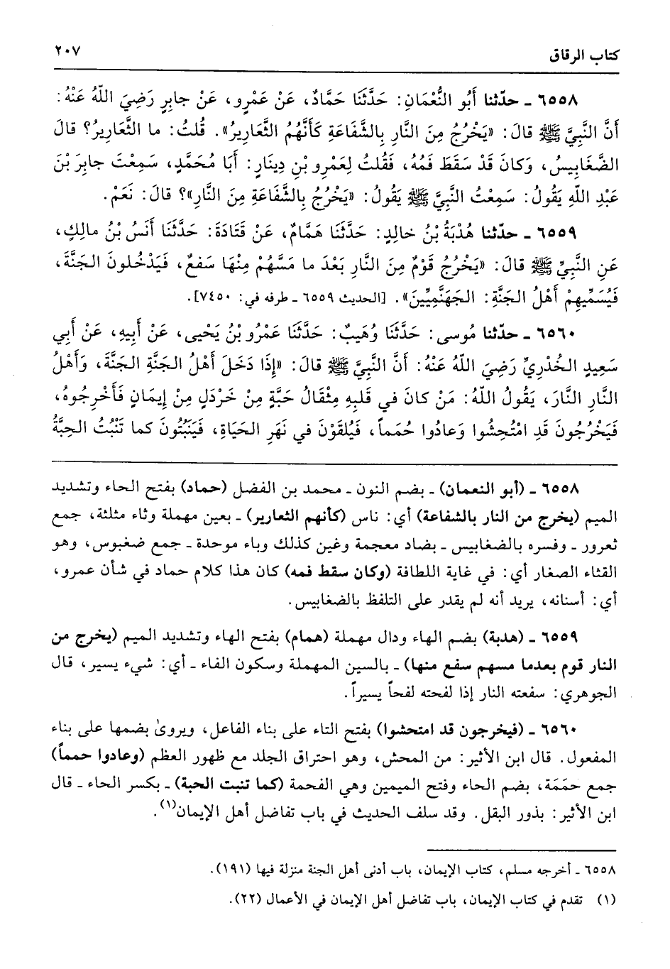 6559 - حَدَّثَنَا هُدْبَةُ بْنُ خَالِدٍ حَدَّثَنَا هَمَّامٌ عَنْ قَتَادَةَ حَدَّثَنَا أَنَسُ بْنُ مَالِكٍ عَنِ النَّبِيِّ - صلى الله عليه وسلم - قَالَ «يَخْرُجُ قَوْمٌ مِنَ النَّارِ بَعْدَ مَا مَسَّهُمْ مِنْهَا سَفْعٌ، فَيَدْخُلُونَ الْجَنَّةَ، فَيُسَمِّيهِمْ أَهْلُ الْجَنَّةِ الْجَهَنَّمِيِّينَ». طرفه 7450