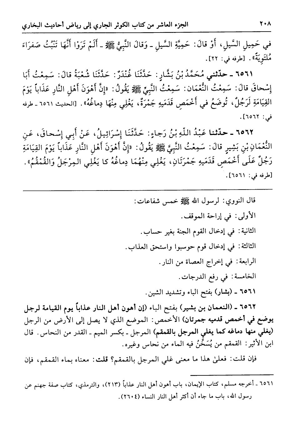 6562 - (النعمان بن بشير) بفتح الباء (أن أهون أهل النار عذابًا يوم القيامة لرجل يوضع في أخمص قدميه جمرتان) الأخمص: الموضع الذي لا يصل إلى الأرض من الرجل (يغلي منها دماغه كما يفلي المرجل بالقمقم) المرجل -بكسر الميم- القدر من النحاس. قال ابن الأثير: القمقم من يُسَخَّنُ فيه الماء من نحاس وغيره.