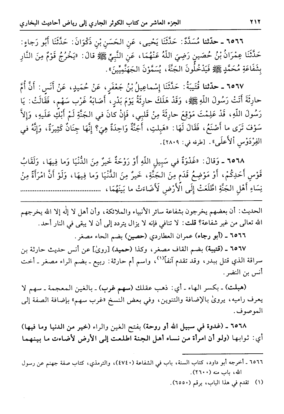 6567 - (قتيبة) بضم القاف مصغر، وكذا (حميد) [روى] عن أنس حديث حارثة بن سراقة الذي قتل ببدر، وقد تقدم آنفًا، واسم أم حارثة: ربيع -بضم الراء مصغر- أخت أنس بن النضر.