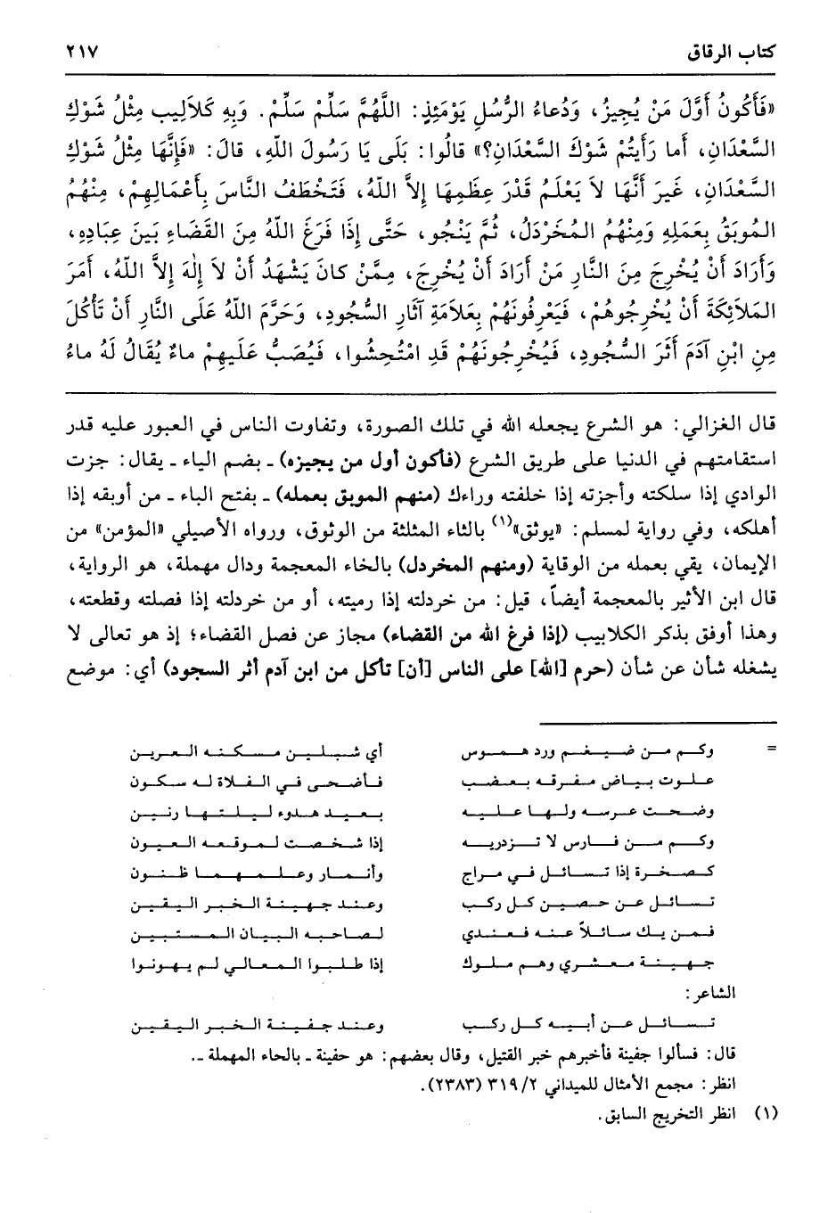«فَأَكُونُ أَوَّلَ مَنْ يُجِيزُ، وَدُعَاءُ الرُّسُلِ يَوْمَئِذٍ اللَّهُمَّ سَلِّمْ سَلِّمْ، وَبِهِ كَلاَلِيبُ مِثْلُ شَوْكِ السَّعْدَانِ، أَمَا رَأَيْتُمْ شَوْكَ السَّعْدَانِ». قَالُوا بَلَى يَا رَسُولَ اللَّهِ. قَالَ «فَإِنَّهَا مِثْلُ شَوْكِ السَّعْدَانِ، غَيْرَ أَنَّهَا لاَ يَعْلَمُ قَدْرَ عِظَمِهَا إِلاَّ اللَّهُ، فَتَخْطَفُ النَّاسَ بِأَعْمَالِهِمْ، مِنْهُمُ الْمُوبَقُ، بِعَمَلِهِ وَمِنْهُمُ الْمُخَرْدَلُ، ثُمَّ يَنْجُو، حَتَّى إِذَا فَرَغَ اللَّهُ مِنَ الْقَضَاءِ بَيْنَ عِبَادِهِ، وَأَرَادَ أَنْ يُخْرِجَ مِنَ النَّارِ مَنْ أَرَادَ أَنْ يُخْرِجَ، مِمَّنْ كَانَ يَشْهَدُ أَنْ لاَ إِلَهَ إِلاَّ اللَّهُ، أَمَرَ الْمَلاَئِكَةَ أَنْ يُخْرِجُوهُمْ، فَيَعْرِفُونَهُمْ بِعَلاَمَةِ آثَارِ السُّجُودِ، وَحَرَّمَ اللَّهُ عَلَى النَّارِ أَنْ تَأْكُلَ مِنِ ابْنِ آدَمَ أَثَرَ السُّجُودِ، فَيُخْرِجُونَهُمْ قَدِ امْتُحِشُوا، فَيُصَبُّ عَلَيْهِمْ مَاءٌ يُقَالُ لَهُ