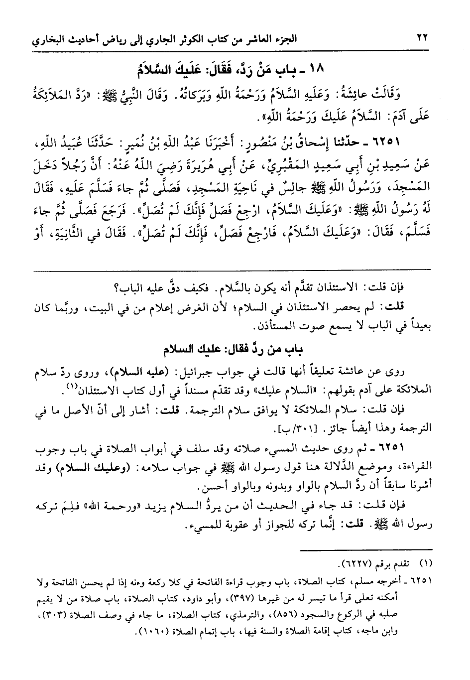 6251 - ثم روى حديث المسيء صلاته وقد سلف في أبواب الصلاة في باب وجوب القراءة، وموضع الدَّلالة هنا قول رسول الله - صلى الله عليه وسلم - في جواب سلامه: (وعليك السلام) وقد أشرنا سابقًا أن ردَّ السلام بالواو وبدونه وبالواو أحسن.