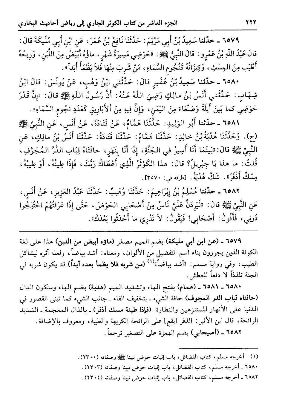 6580 - 6581 - (همام) بفتح الهاء وتشديد الميم (هدبة) بضم الهاء وسكون الدال (حافتاه قباب الدر المجوف) حافة الشيء -بتخفيف الفاء- جانب الشيء كما تبنى القصور في الدنيا على الأنهار للمتنزهين والنطارة (فإذا طينة مسك أذفر) -بالذال المعجمة- الشديد الرائحة، قال ابن الأثير: الذفر [يقع] على الرائحة الكريهة والطيبة، ومعروف بالإضافة.