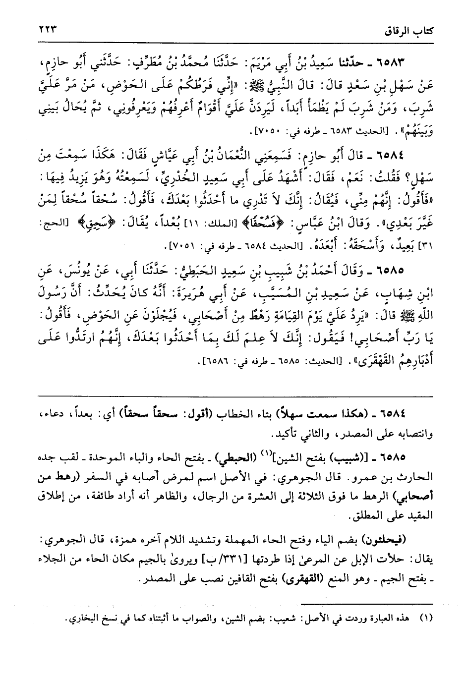 6585 - وَقَالَ أَحْمَدُ بْنُ شَبِيبِ بْنِ سَعِيدٍ الْحَبَطِىُّ حَدَّثَنَا أَبِى عَنْ يُونُسَ عَنِ ابْنِ شِهَابٍ عَنْ سَعِيدِ بْنِ الْمُسَيَّبِ عَنْ أَبِى هُرَيْرَةَ أَنَّهُ كَانَ يُحَدِّثُ أَنَّ رَسُولَ اللَّهِ - صلى الله عليه وسلم - قَالَ «يَرِدُ عَلَىَّ يَوْمَ الْقِيَامَةِ رَهْطٌ مِنْ أَصْحَابِى فَيُحَلَّئُونَ عَنِ الْحَوْضِ فَأَقُولُ يَا رَبِّ أَصْحَابِى. فَيَقُولُ إِنَّكَ لاَ عِلْمَ لَكَ بِمَا أَحْدَثُوا بَعْدَكَ، إِنَّهُمُ ارْتَدُّوا عَلَى أَدْبَارِهِمُ الْقَهْقَرَى». طرفه 6586