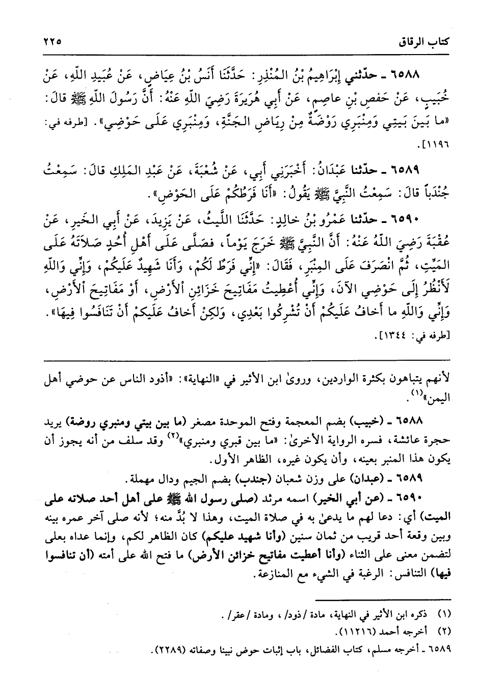6590 - حَدَّثَنَا عَمْرُو بْنُ خَالِدٍ حَدَّثَنَا اللَّيْثُ عَنْ يَزِيدَ عَنْ أَبِى الْخَيْرِ عَنْ عُقْبَةَ - رضى الله عنه - أَنَّ النَّبِىَّ - صلى الله عليه وسلم - خَرَجَ يَوْمًا فَصَلَّى عَلَى أَهْلِ أُحُدٍ صَلاَتَهُ عَلَى الْمَيِّتِ، ثُمَّ انْصَرَفَ عَلَى الْمِنْبَرِ فَقَالَ «إِنِّى فَرَطٌ لَكُمْ، وَأَنَا شَهِيدٌ عَلَيْكُمْ، وَإِنِّى وَاللَّهِ لأَنْظُرُ إِلَى حَوْضِى الآنَ، وَإِنِّى أُعْطِيتُ مَفَاتِيحَ خَزَائِنِ الأَرْضِ - أَوْ مَفَاتِيحَ الأَرْضِ - وَإِنِّى وَاللَّهِ مَا أَخَافُ عَلَيْكُمْ أَنْ تُشْرِكُوا بَعْدِى، وَلَكِنْ أَخَافُ عَلَيْكُمْ أَنْ تَنَافَسُوا فِيهَا». طرفه 1344
